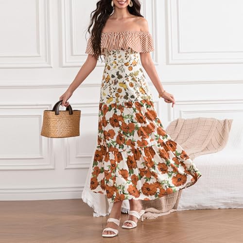 Woman Summer Floral Off Shoulder Long Dress Elastic Ruffled Short Sleeves Maxi Dresses Slim Fit Smocking Dress