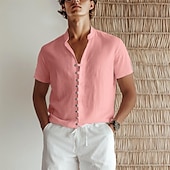 HOT ! Men's Linen Shirt Summer Shirt Beach Wear Button Up Shirt Plain Vacation Beach White Pink Blue Green Short Sleeve Stand Collar Spring & Summer Clothing Apparel Basic