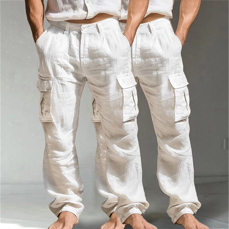 Men's Cargo Trousers Linen Pants Summer Pants Casual Pants Multi Pocket Straight Leg Plain Comfort Breathable Full Length Outdoor Daily Going out Fashion Streetwear White+khaki Khaki+Black Inelastic 1