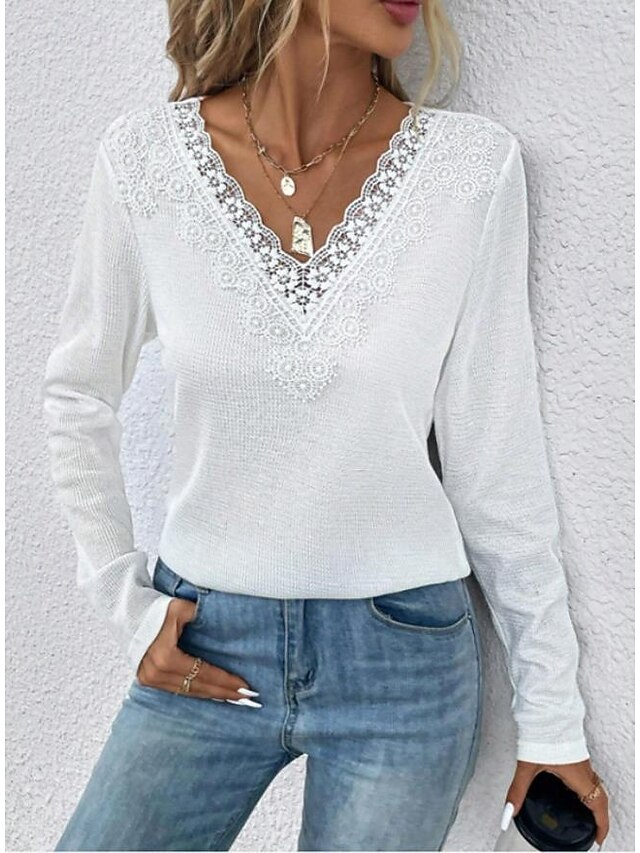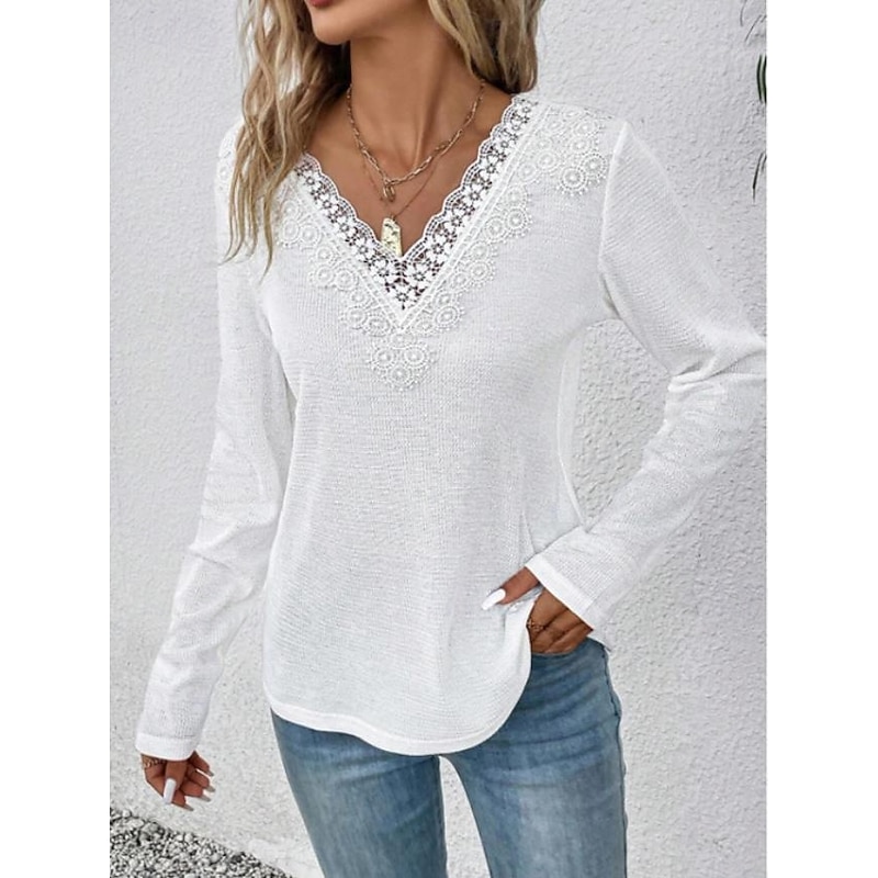 Highlights [Fabric]: Crafted from high-quality polyester, this women's top offers a lightweight, breathable, and micro-elastic fabric that ensures all-day comfort. The soft, slightly textured material enhances the overall fit and feel of the garment. [Fit]: The loose fit design of this T-shirt allows for a relaxed yet polished appearance. The regular top length and micro-elastic property provide a flattering fit, making it ideal for various body types. [Design Highlights]: Featuring an elegant V-neckline adorned with delicate lace detailing, this top adds a touch of sophistication to your everyday wardrobe. The long-sleeve design offers both comfort and style, while the plain pattern enhances its versatility. [Occasions]: Perfect for daily casual outings, this women's T-shirt is suitable for spring and fall seasons. Whether you're going for a relaxed day out or a weekend gathering, this blouse effortlessly complements jeans or skirts, offering a chic yet casual look. [Size Range]: Available in a variety of sizes including S, M, L, XL, and 2XL, this top offers a wide range of options to ensure the perfect fit for every wearer.