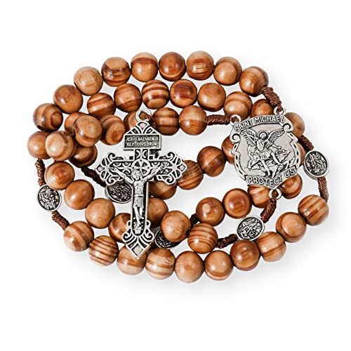 • Five Decades Saint Michael Rosary. 8mm Wooden Beads Knotted with strong Rugged Cord, 1.7" Jesus Crucifix, and Saint Protection Medal.