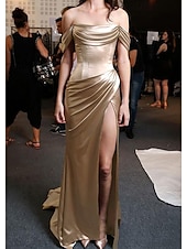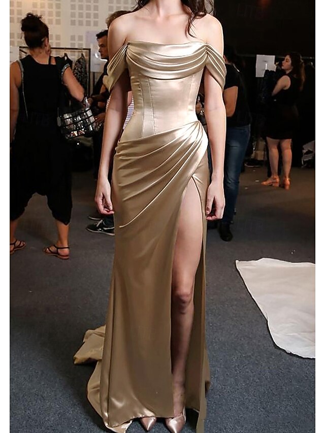 HOT ! Gold Lurex Stretch Fabric Off Shoulder Mermaid / Trumpet Stretch Jersey Evening Gown Elegant Dress Formal Wedding Sweep / Brush Train with Ruched Slit 2025
