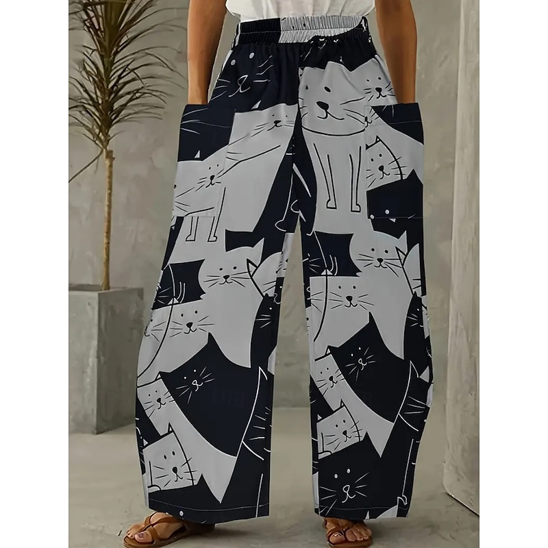 HOT ! Women's Wide Leg Chinos Pants Trousers Vacation Fashion Casual Full Length High WaistPantsHalloween Cat Pocket Elastic Waistband Printing Comfy Soft Comfortable Stretchy Outdoor Street Black Yellow