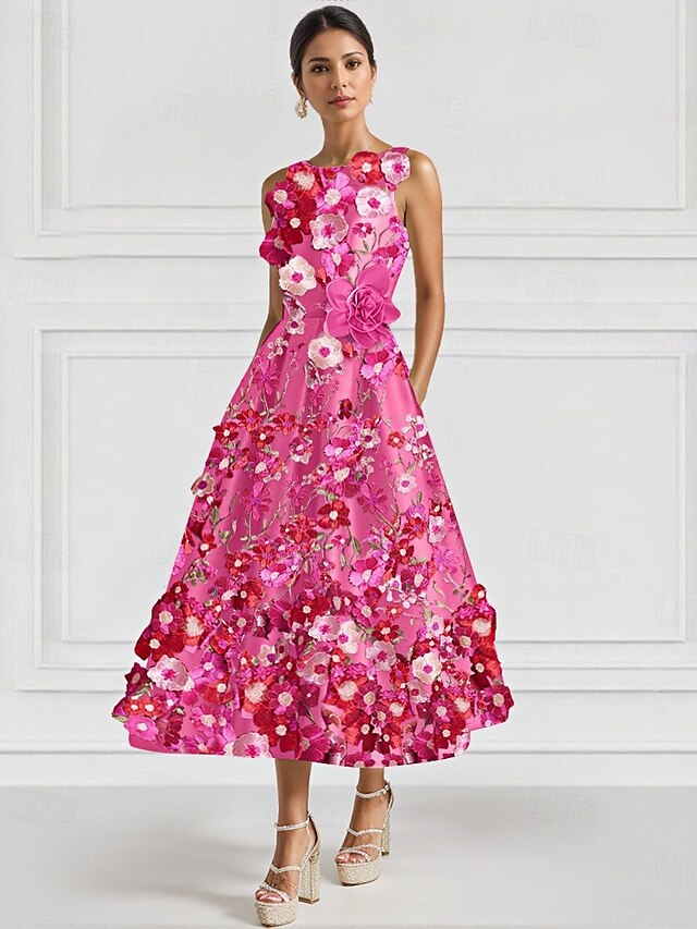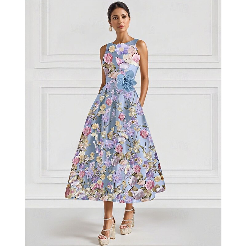 A-Line Floral Cocktail Elegant Dress Formal Gown Wedding Guest Ankle Length Sleeveless Crew Neck Satin with Embroidered Pocket 1