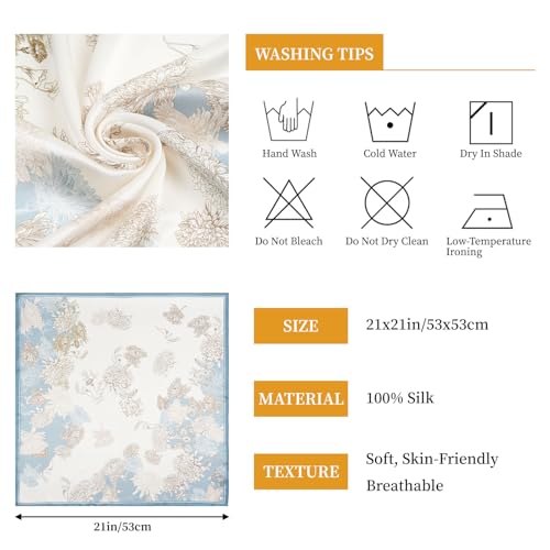 • Wide Uses - Our neck scarves for women lightweight silk are approximately 21 inches x 21 inches (53cm x 53cm). Whether you wear them around your neck, waist, wrists, ankles, hair and head, or use as silk hair scarf, womens head scarf, scarf for purse, handbag scarf, hat charm through different knotting and wearing methods, they are an fashion accessories that can perfectly match your overall look and clothing in any occasion