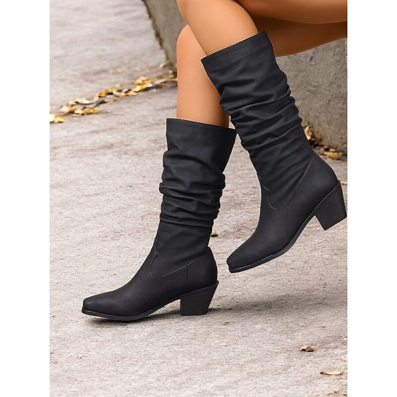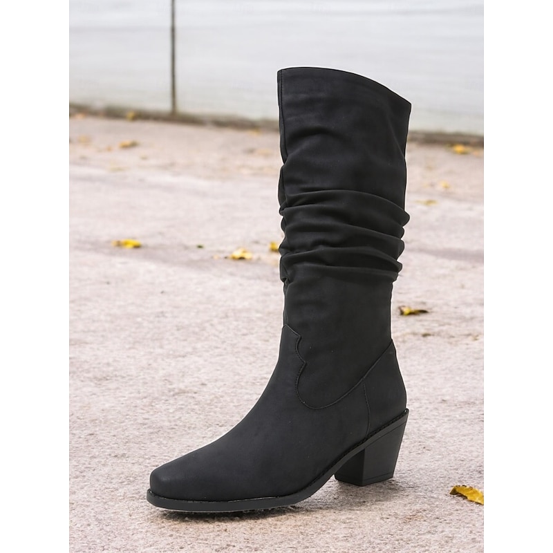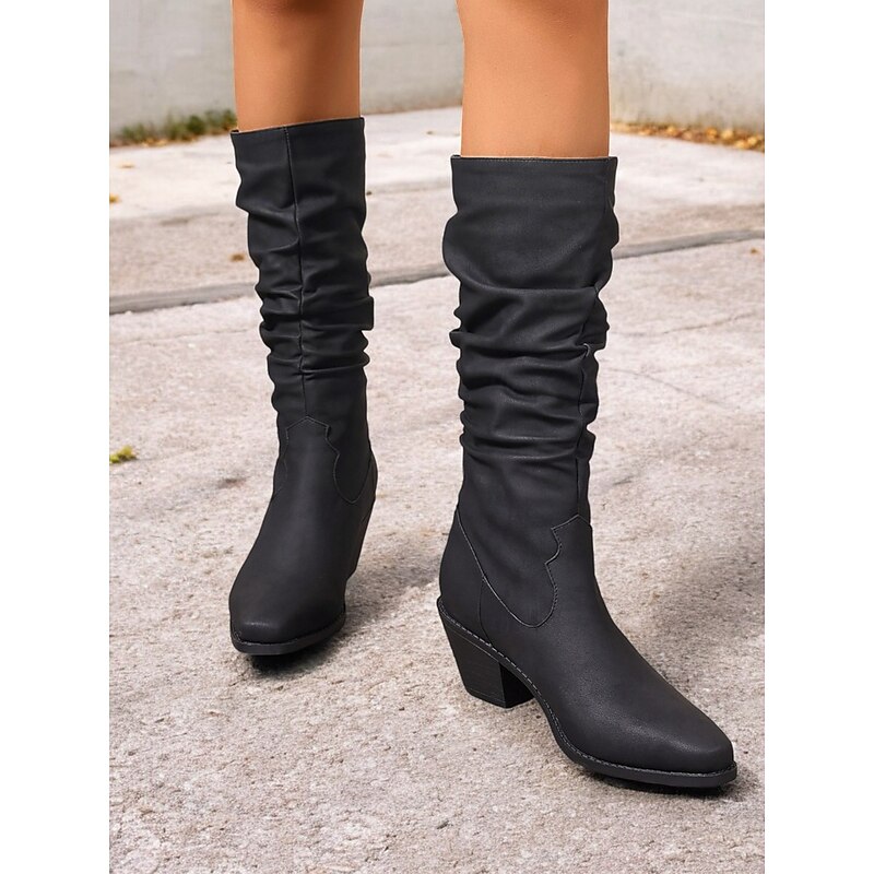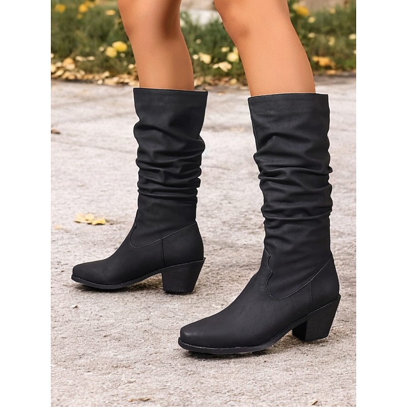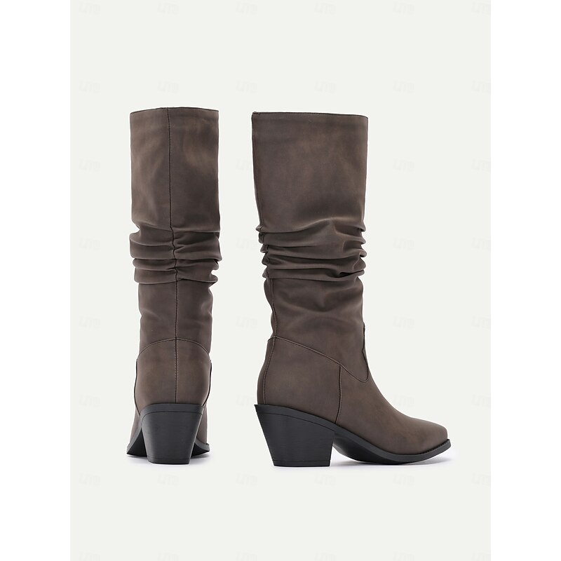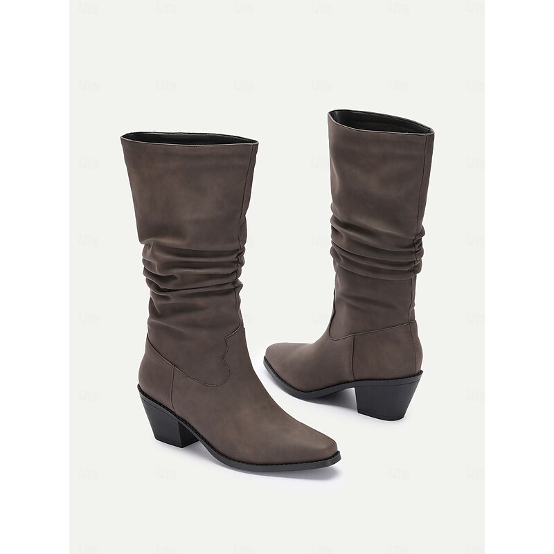 Highlights [Fabric] : Constructed from high-quality PU leather, these Women's Slouchy Mid-Calf Western Boots boast a durable and sophisticated texture. The fleece lining adds warmth and comfort, making them ideal for the cooler months of spring, fall, and winter. [Fit] : Featuring a chic slouchy design, these boots offer a relaxed and casually stylish fit. The calf-length silhouette keeps you warm while ensuring comfort and ease of wear throughout the day. The square-toe design provides ample room, enhancing overall comfort. [Design Highlights] : These vintage-inspired boots are characterized by their stacked chunky heel, which provides both stability and a subtle lift. The neutral dark brown color, along with the loafer-style closure, adds to the boots' versatility and complements a variety of outfits. The retro cowboy style with modern updates makes them a timeless addition to any wardrobe. [Occasions] : Perfect for everyday wear, whether you're heading to work or enjoying a casual day out. These boots blend fashion and function, making them suitable for both city adventures and countryside strolls during vacation or routine errands. [Size Notice] : Available in a range of sizes from US 5.5 to US 10.5, these boots are designed to fit standard sizing. We recommend selecting your usual size to ensure the best fit and comfort.