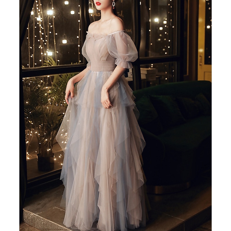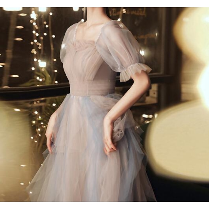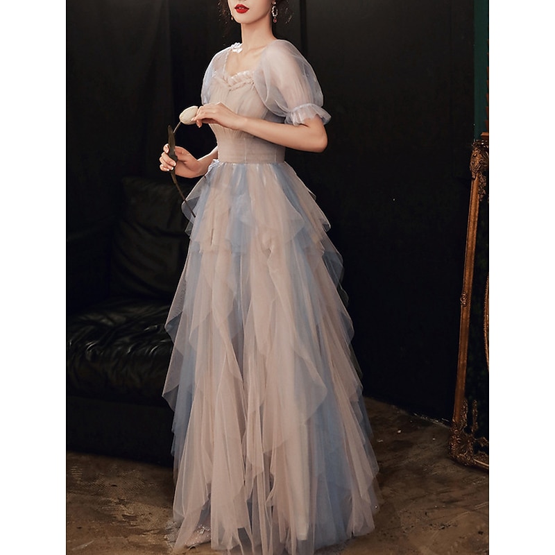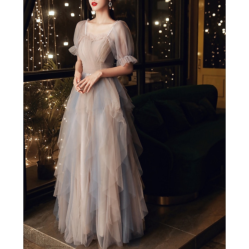 More information about A-Line Prom Dresses Color Block Dress Wedding Party Dress Birthday Floor Length Half Sleeve Scoop Neck Tulle with Pleats Ruffles Masquerade Dress to impress
