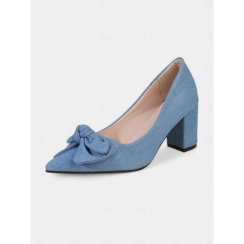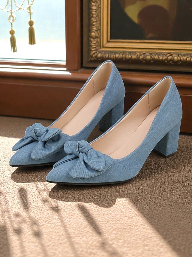 HOT ! Women's Light Blue Bow Block Heel Pumps – 1950s Vintage Pointed Toe Denim Fabric Heels for Office, Weddings, and Daily Wear