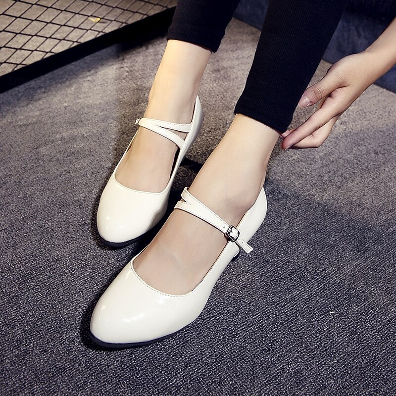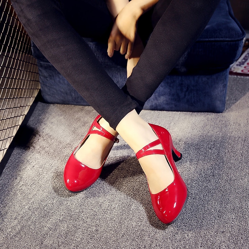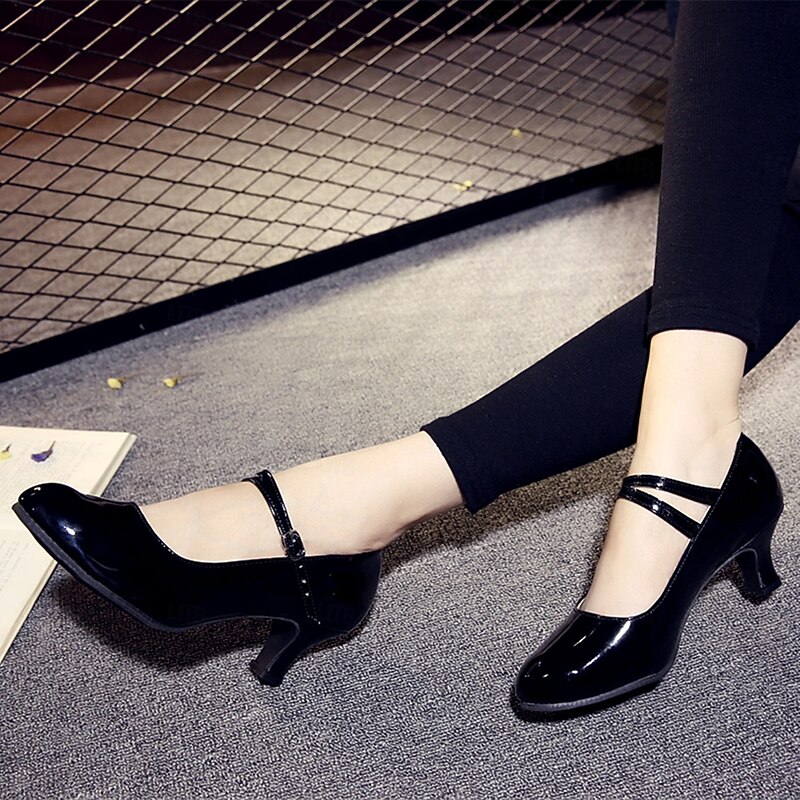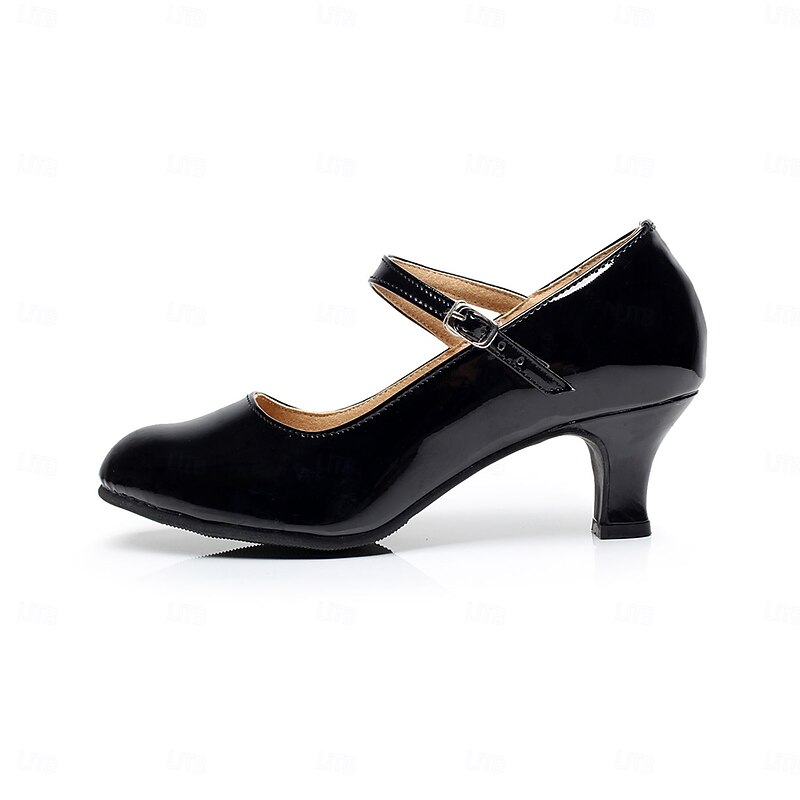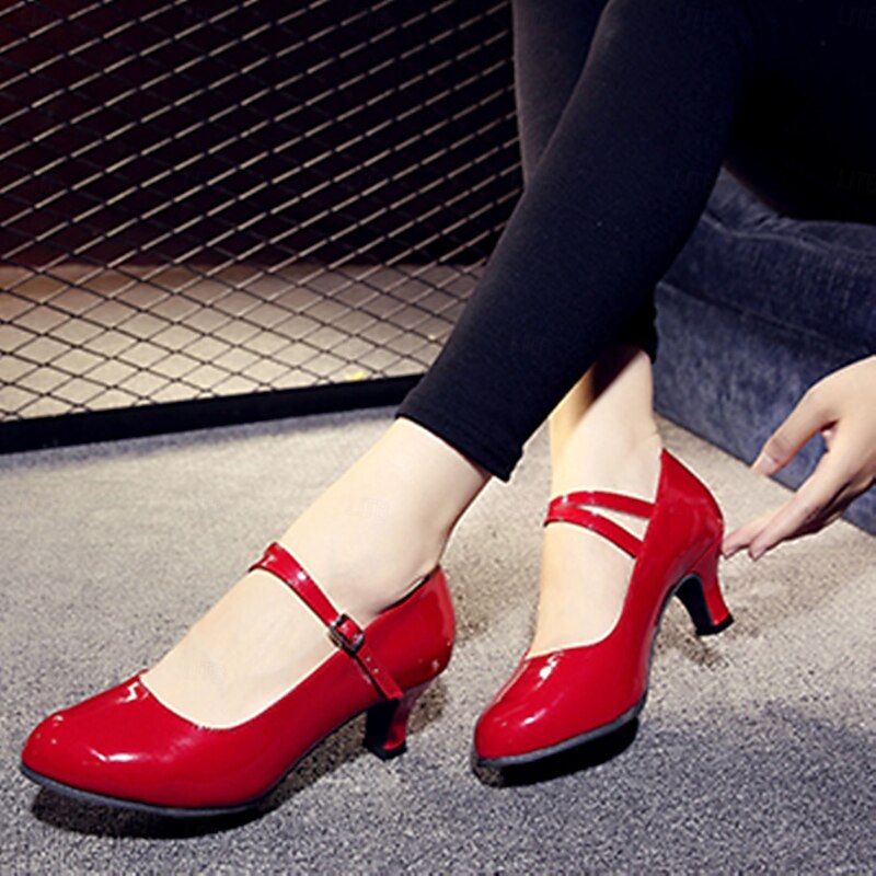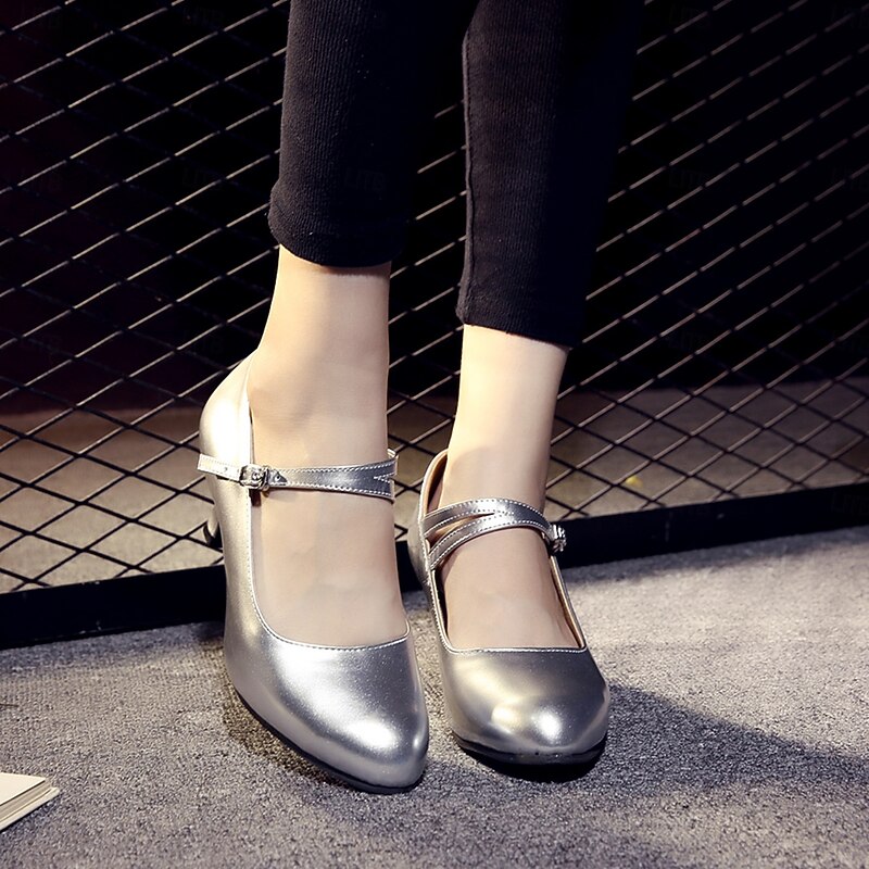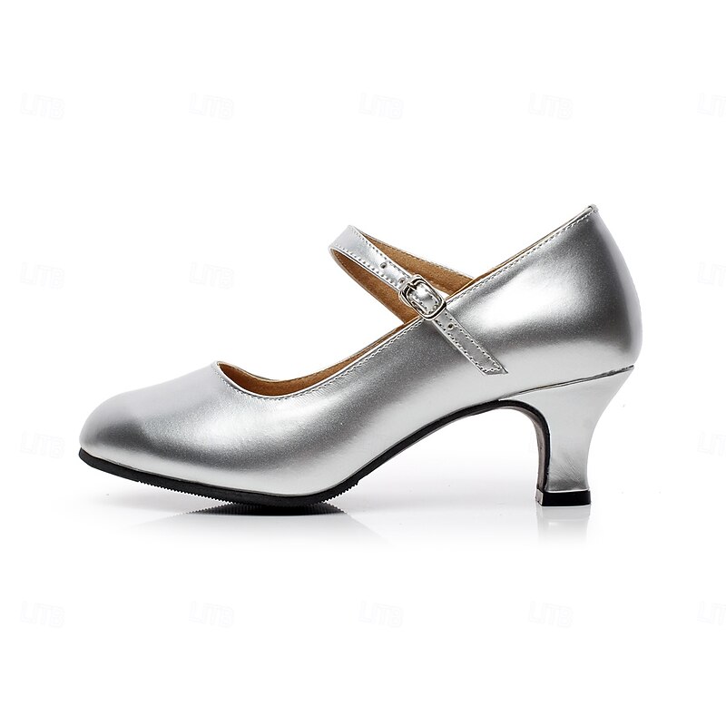 Highlights [Fabric] Made from high-quality PU leather, these sleek women's dance shoes provide durability and comfort. The fabric lining ensures a breathable interior, perfect for long hours on the dance floor, while the leather outsole offers stable traction. [Fit and Style] With a classic Mary Jane silhouette, these shoes feature an adjustable buckle strap that provides a secure and customizable fit. The round toe and low block Cuban heel add comfort and style, making them a practical choice for all-day wear. [Design Highlights] The metallic finish of these dance shoes adds a touch of glamour to any ensemble. Available in a variety of colors, including striking silver and elegant dark red, they are designed to make a statement. The 1 1/2-inch thick heel offers a perfect balance between style and support. [Occasions] Ideal for prom, ballroom dance, and square dance, these versatile shoes are suitable for both casual and formal events. Whether it's a lively party or a sophisticated evening out, they will enhance your look with elegance and flair. [Size Suggestions] Available in a comprehensive range of sizes from US5 to US11.5, these shoes cater to adults, offering a good fit across various foot types. For those with wider feet, selecting a size up is recommended for optimal comfort.