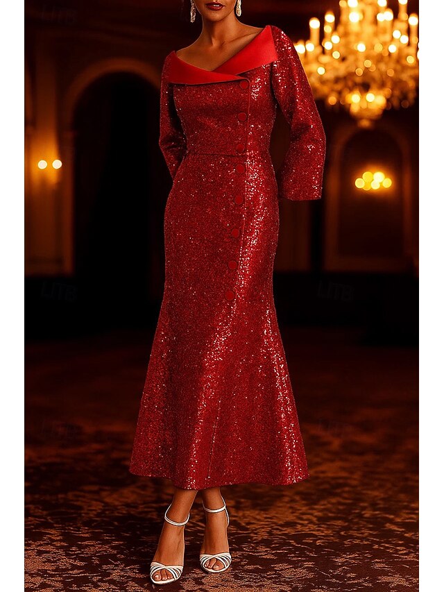 HOT ! Tuxedo Dress Portrait Collar Sequin Blazer Dress Mermaid / Trumpet Formal Wedding Satin Elegant 3/4 Sleeve Tea Length Midi Length