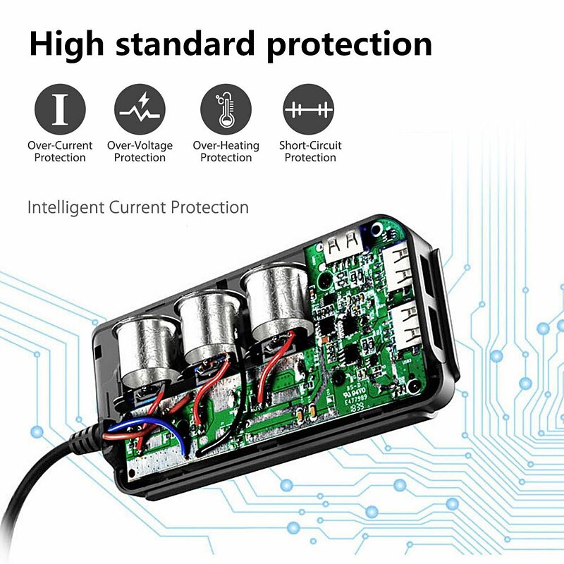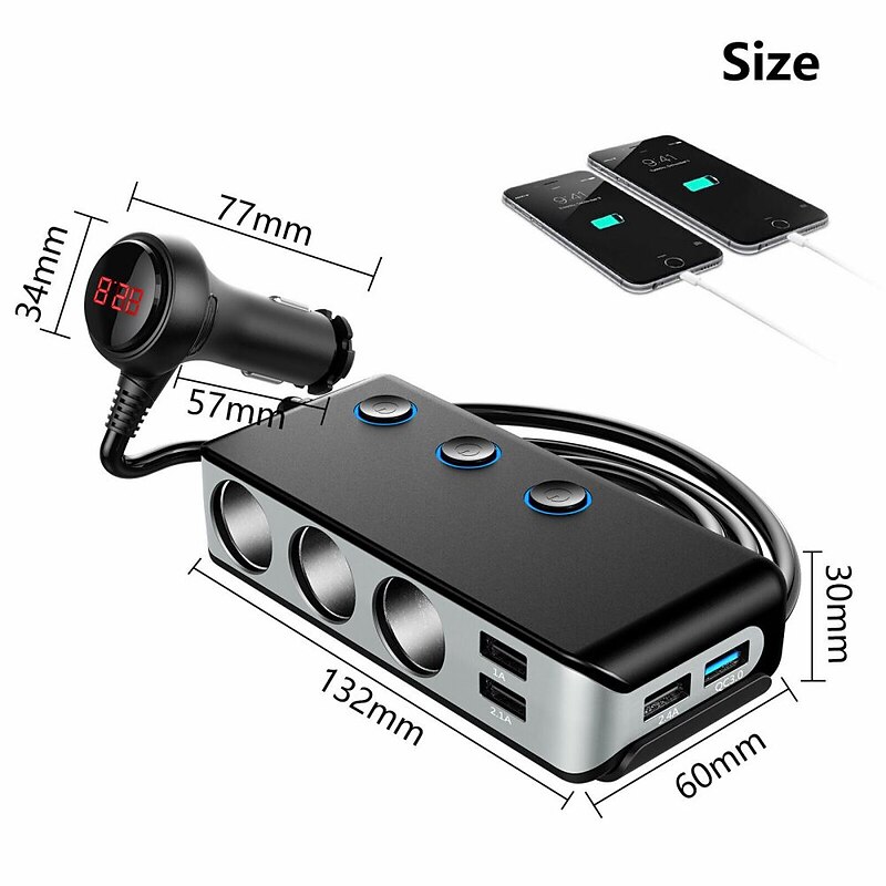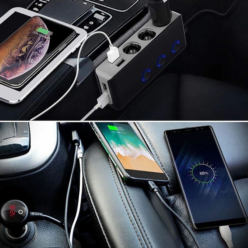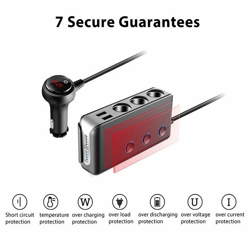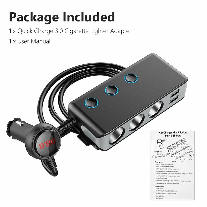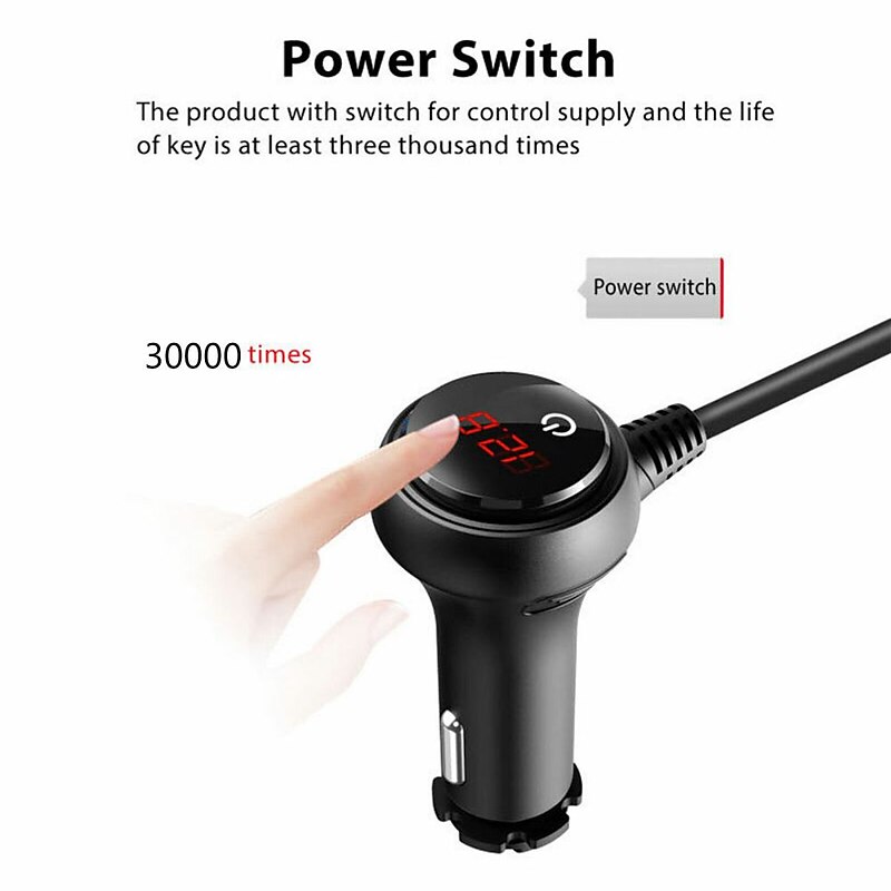 Our product also comes with an on/off switch and LED voltage display, giving you more control over your charging devices. The main switch for the car charger and independent on/off switch for each cigarette socket allow you to turn on or off the device, prolonging the lifespan of your device without affecting other charging devices. The red light LED voltmeter helps you monitor the voltage of your car's battery in real-time. Furthermore, if the voltage is under 10.5V, the display will flash a warning number.