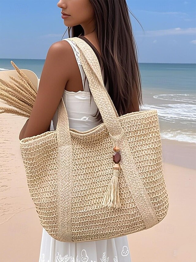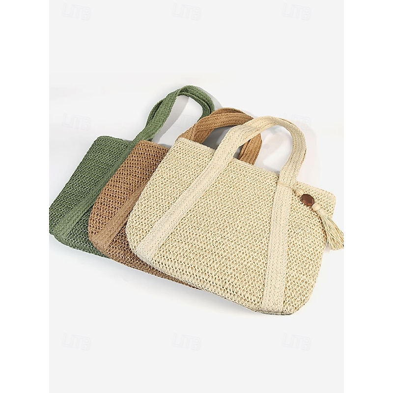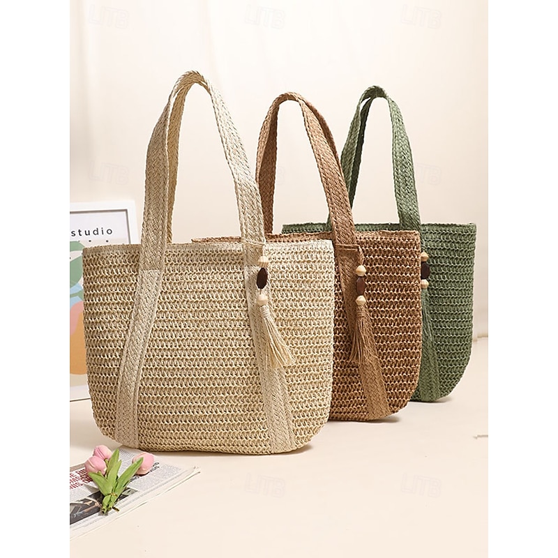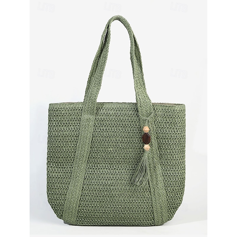 HOT ! Women's Woven Straw Tote Bag with Tassel – Large Summer Beach Handbag for Vacation, Travel and Casual Outings Color White Green Khaki
