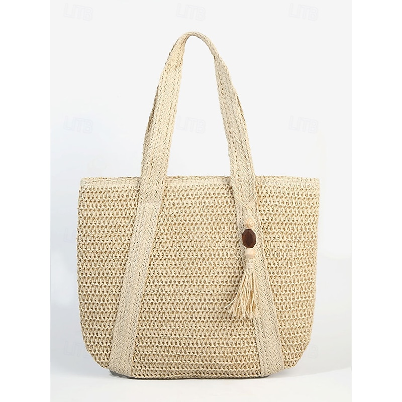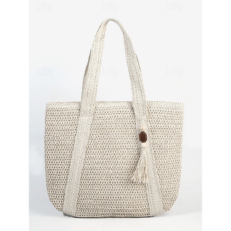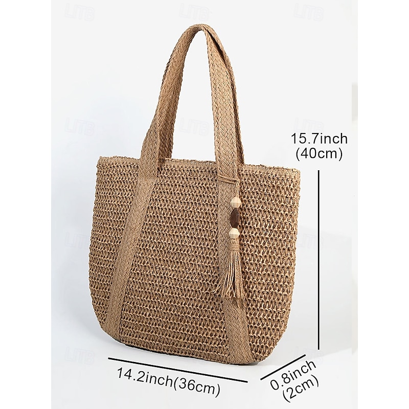 Women's Woven Straw Tote Bag with Tassel – Large Summer Beach Handbag for Vacation, Travel and Casual Outings Color White Green Khaki 18