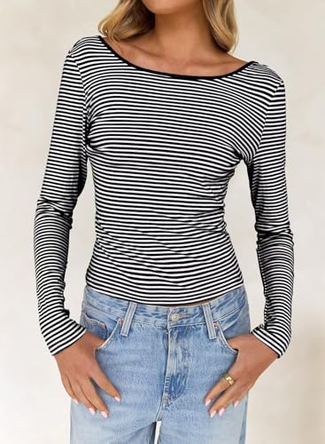 • chic Design: The womens tops' combination of stripes and a backless design creates a chic and trendy look; ideal for making a statement on any occasion; with a boat neck cut, fitted to accentuate the silhouette and showcase feminine charm