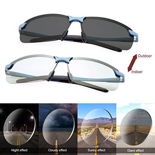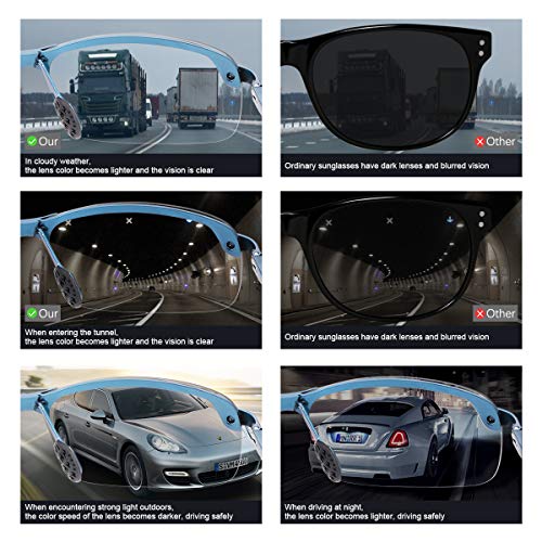 • 【Photochromic ‘black technology'】YIMI men' women' sunglasses adopt smart color-changing factor, the lens can feel the change of light and make the color change. In sunny outdoor, the color becomes darker, and at night and indoors, the color will change shallow. Transparent lens, high light transmittance, uniform discoloration, high-definition vision.
