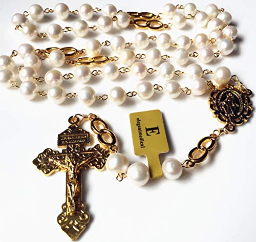 elegantmedical Handmade GOLD White Pearls Bead Necklace Lasso Wedding Rosary Cross Crucifix Catholic gift 4