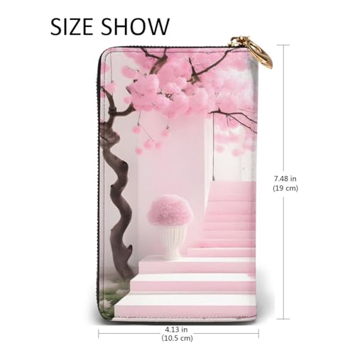 HOT ! Pink Cherry Blossom Staircase Prints Leather Long Clutch Wallet for Fashionable Girls and Women - Durable, Stylish, and Functional, Black, One Size