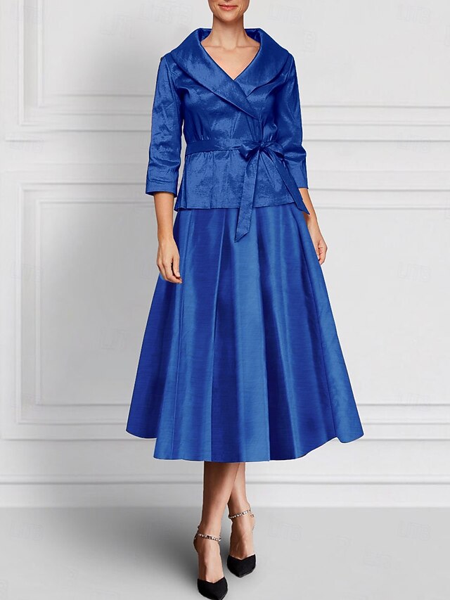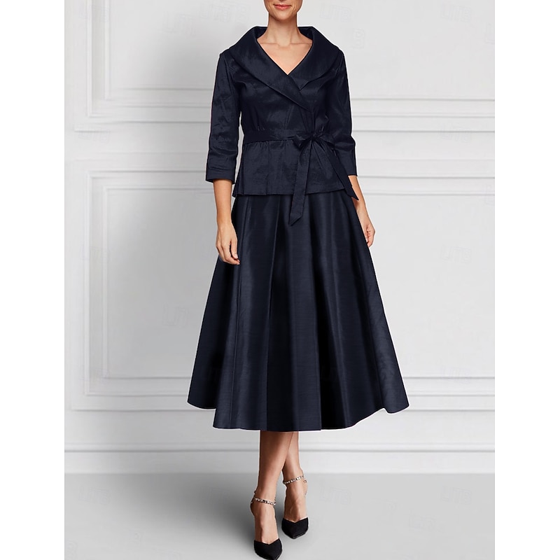 More information about Two Piece A-Line Dress Sets Mother of the Bride Dress Elegant Lapel Floor Length Ankle Length Satin Stretch Fabric Long SleeveBlack Fall Wedding