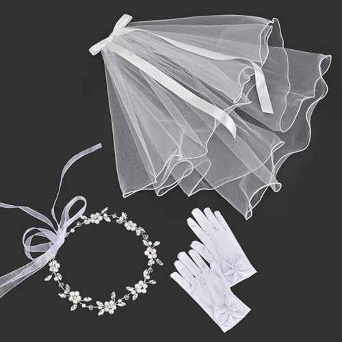 Vividsun 3 Pcs First Communion Veils Set for Girls Bow Gloves Lace Veils Communion Hair Accessories 3