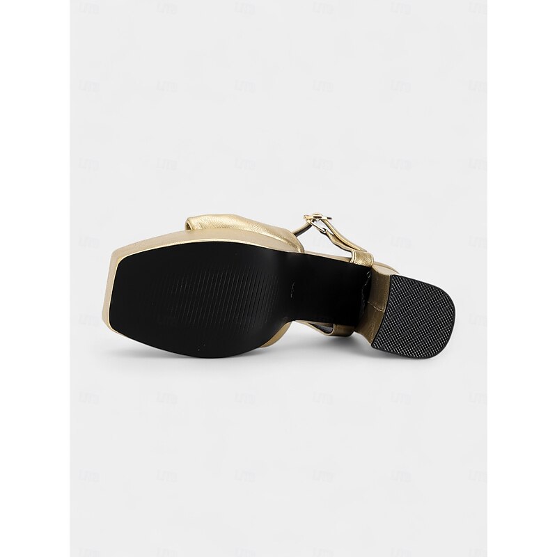 Highlights - Luxurious patent leather upper - Premium synthetic leather lining for comfort - Stylish chunky heel for added height and stability - Trendy open toe design - Durable rubber outsole for long-lasting wear