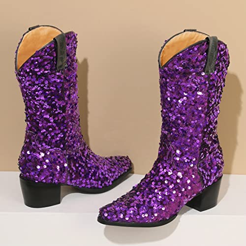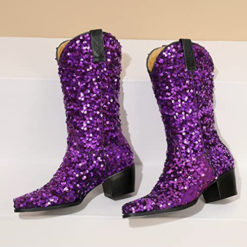 KISSASA Sequin Sparkly Mid Calf Cowboy Boots Glitter Wedding Chunky Heeled Cowgirl Boots 6