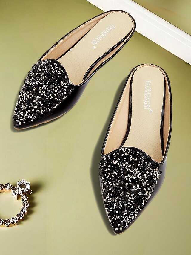 Women's Black Rhinestone Pointed Mules – Slide-On Flats with Crystal Embellishments for Stylish Daily Dates 1