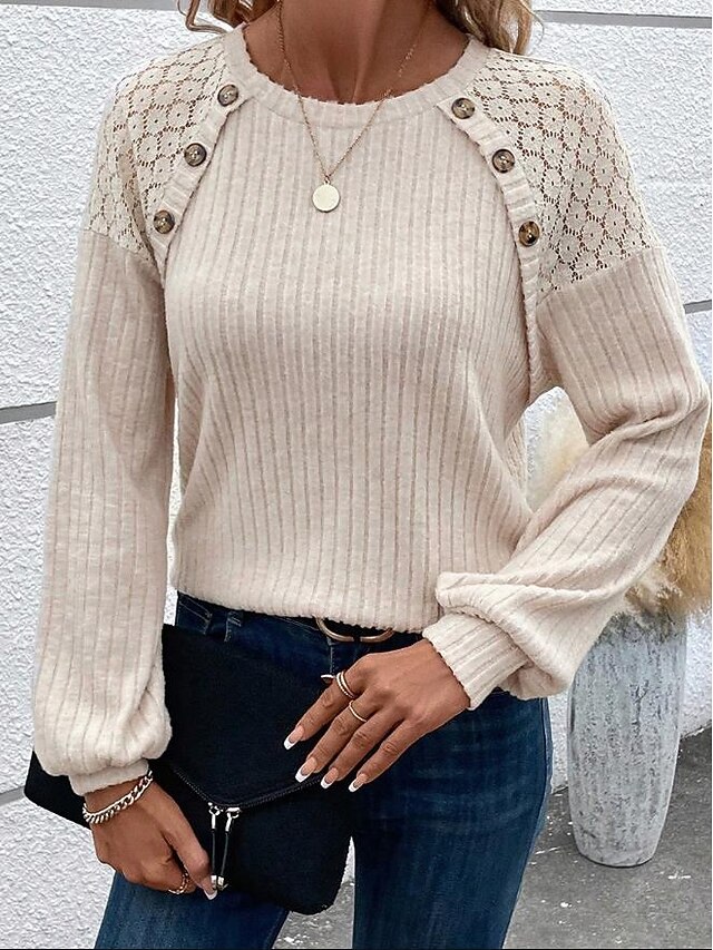 More information about Women's Pullover Elegant Vintage Fashion Plain Work Street Dailywear Crew Neck Patchwork Buttons Loose Fit Long Sleeve White Gray Fall Winter