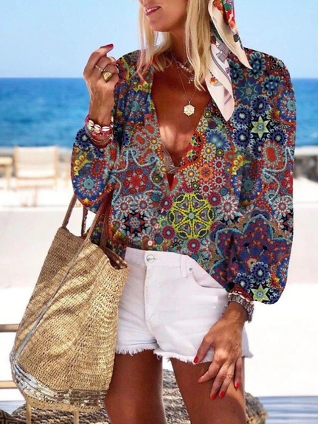 Women's Shirt Blouse White Navy Blue Rainbow Graphic Floral Print Long Sleeve Casual Daily Vintage Tropical Shirt Collar Regular Floral S 10