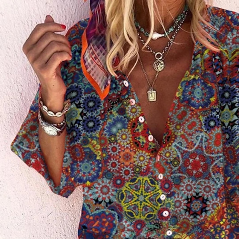 Women's Shirt Blouse White Navy Blue Rainbow Graphic Floral Print Long Sleeve Casual Daily Vintage Tropical Shirt Collar Regular Floral S 7