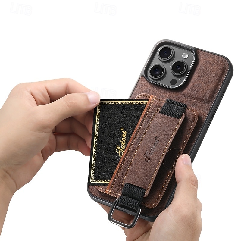More information about Phone Case For iPhone 17 Pro Max 17 Air 16 Pro Max Plus 15 Pro Max Plus 15 14 Pro Max Plus 16e Back Cover with Wrist Strap Kickstand Card Slot Retro TPU PU Leather