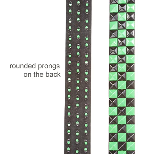 • Green & Black checkerboard studs have rounded prongs on the backs to prevent snagging on pants like all studded belt owners know about.