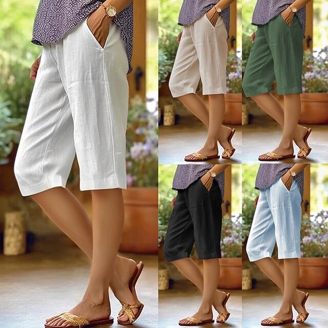 Women's Cotton Linen Pants Slacks Fashion Streetwear Knee Length Natural Plain Pocket Outdoor Comfortable Street Daily Wear Going out Light Sky Blue Black White Army Green Summer Regular Fit 7