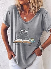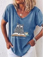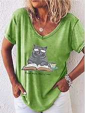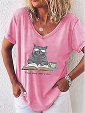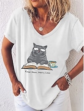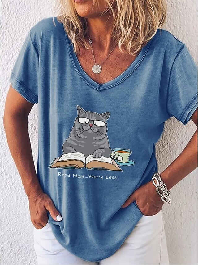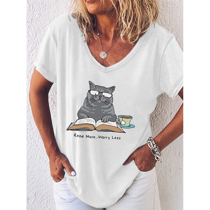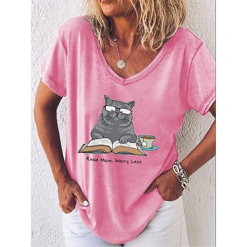 Women's T Shirt Graphic Animal Letter Vintage sophisticated traditional Short Sleeve V Neck Regular Tops Daily Print Black White Pink Blue Green Summer Spring Read More Worry Less Cute Cat