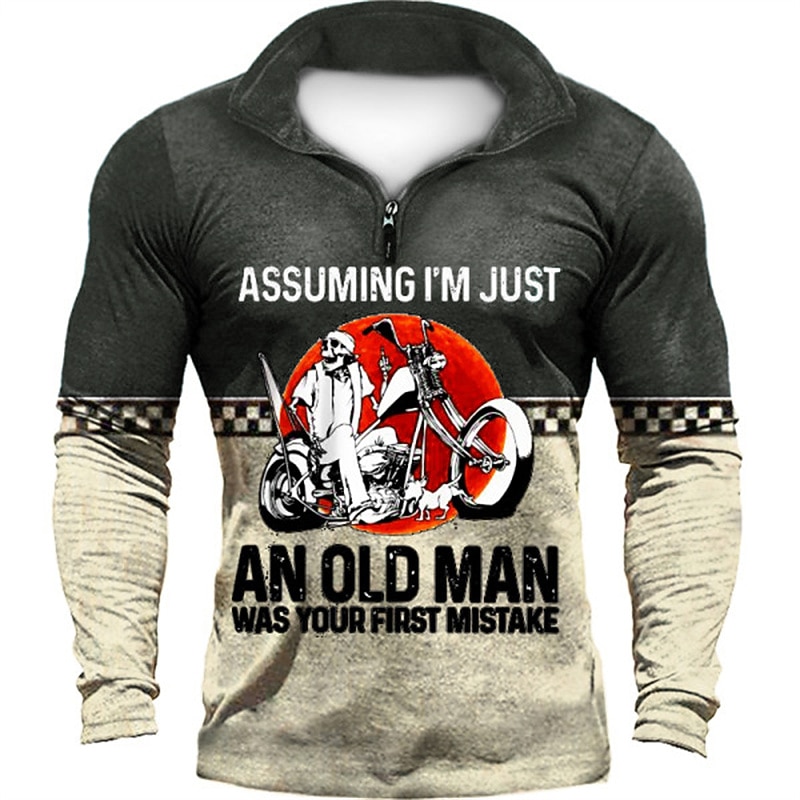 HOT ! Men's Long Sleeve Graphic Tee with Biker Quote: 'Assuming I'm Just An Old Man Was Your First Mistake' Funny Quarter-Zip Shirt