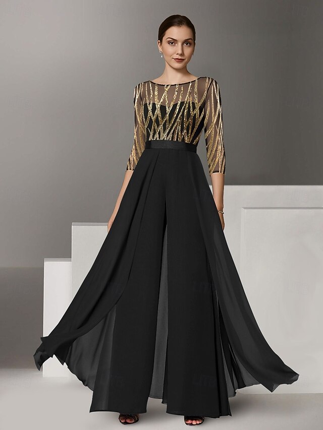 More information about Black and Gold Jumpsuit Mother of the Bride Jumpsuit Elegant Minimalist Casual Boat Neck Floor Length Chiffon Lace Sequined 3/4 Length Sleeve with Color Block