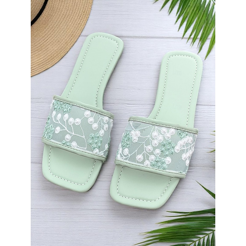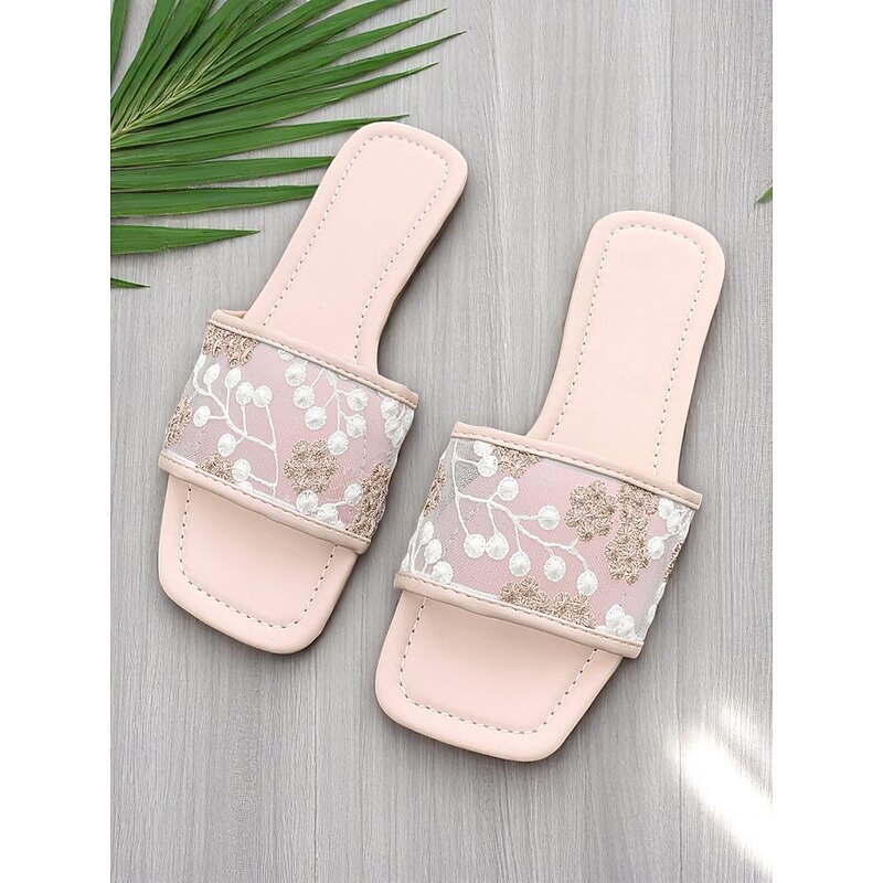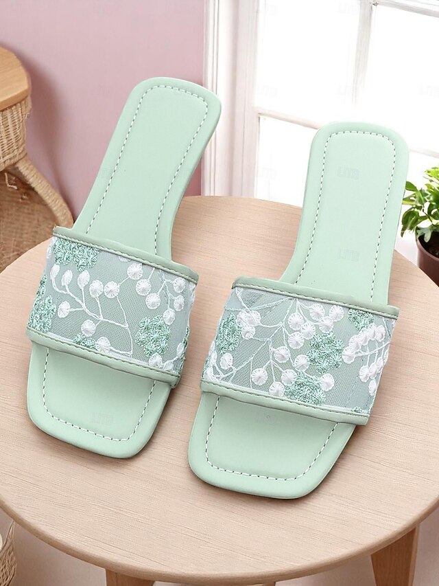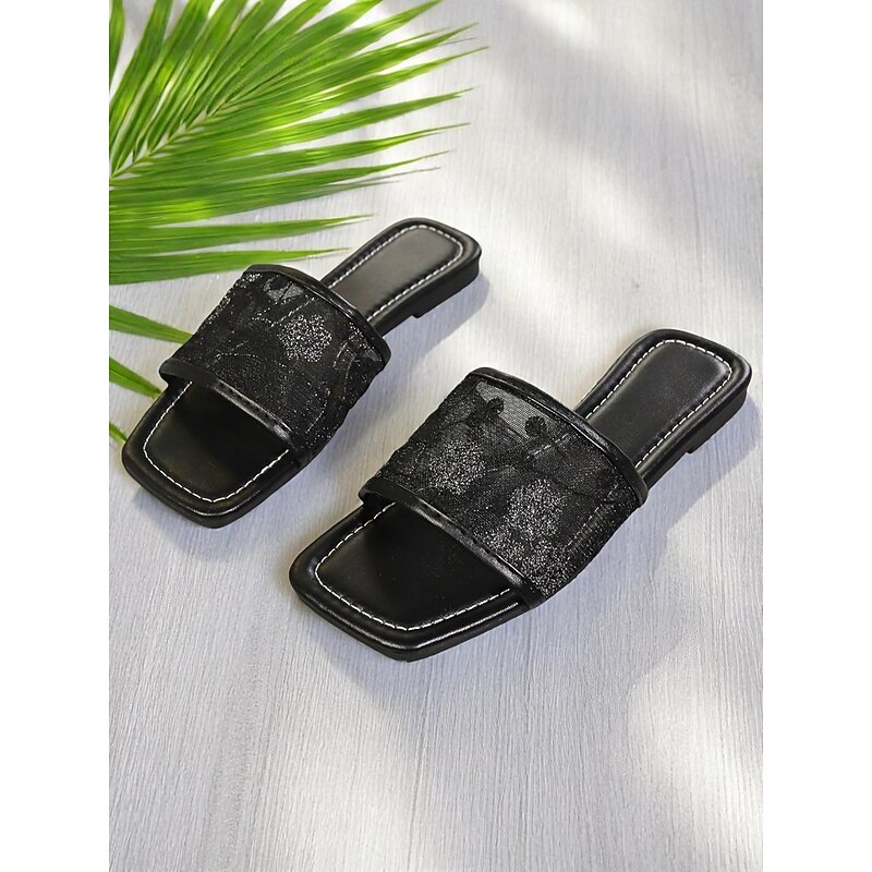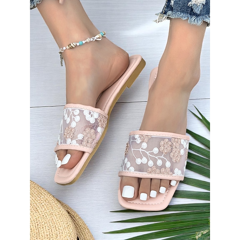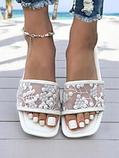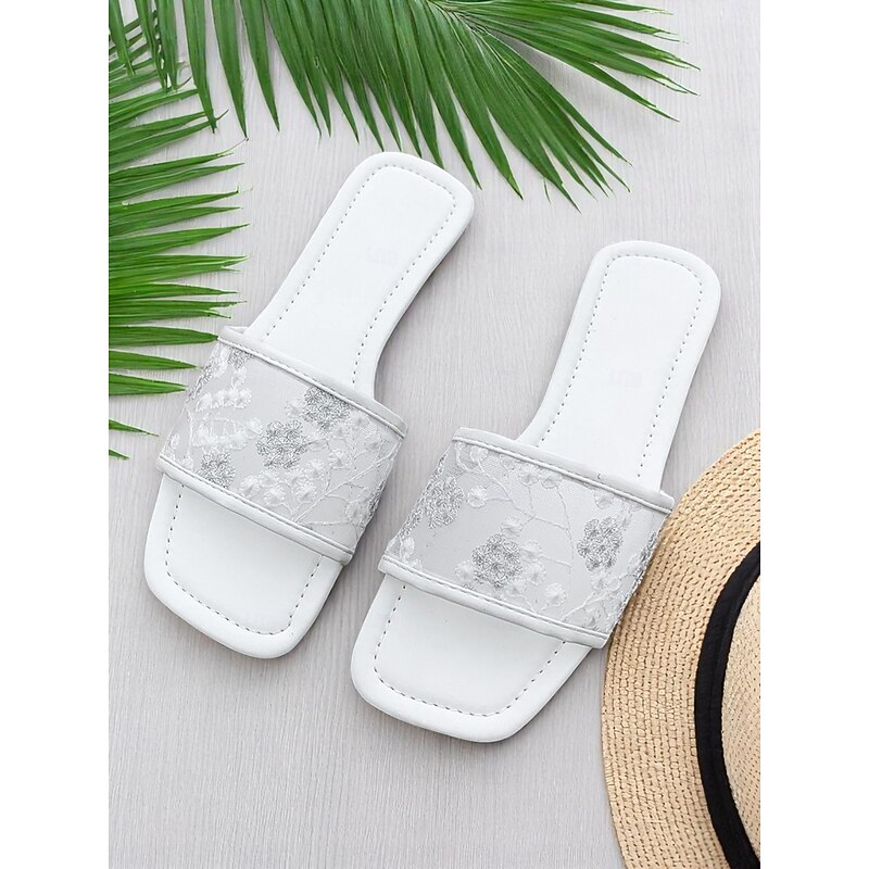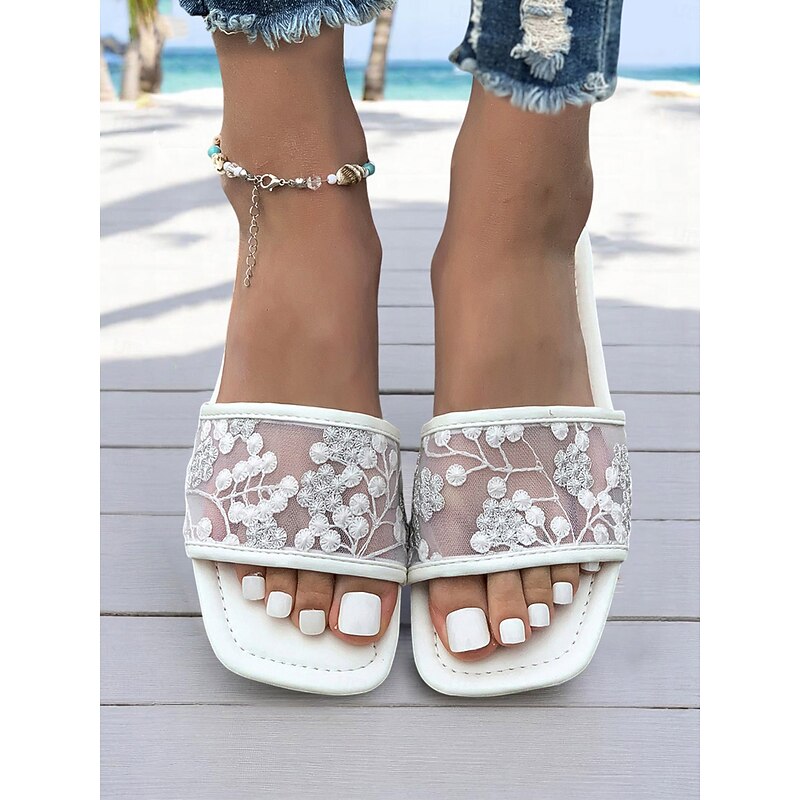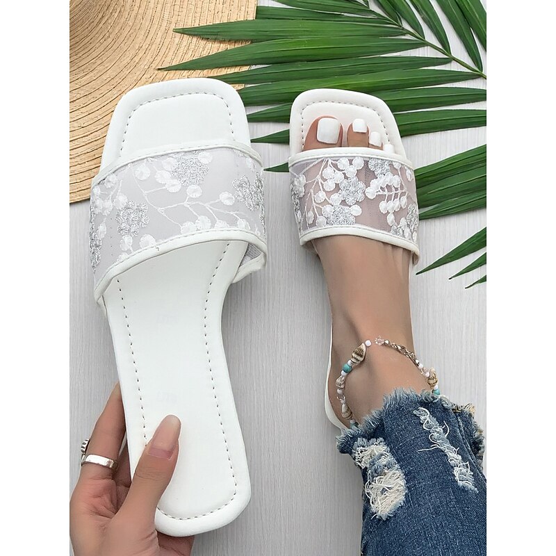 HOT ! Women's White Embroidered Mesh Slide Sandals – Floral Lace Design, Square Toe, Romantic Beach Style for Summer Vacations and Casual Wear