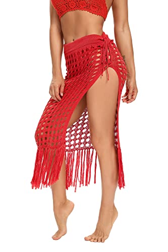 HOT ! Women Sexy Hollow Out Mesh Tassle Skirts Beach Cover Up Summer Fish Net Swimsuit Wrap Sheer Maxi Sarong Swimwear (Color : Red C, Size : Medium)