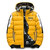 Highlights [Fabric]: Crafted from high-quality polyester, this men's puffer jacket offers excellent warmth and comfort, making it an ideal choice for winter wear. The polyester fabric ensures durability and a soft touch, perfect for outdoor activities in cold weather. [Fit]: This jacket features a regular fit with a padded design, providing optimal insulation and easing mobility. The quilted style with horizontal stitching enhances its sleek appearance while maintaining practicality. [Design Highlights]: The jacket is equipped with a detachable hood, adding versatility and extra protection against the elements. It sports bold yellow accents on the arms for a contemporary flair and modern graphics, including the word "BASE" on the chest, enhancing its sporty look. Zippered side pockets provide secure storage, while elastic cuffs and hem keep warmth in. [Occasions]: Perfect for various outdoor activities, sports, and daily casual wear, this jacket allows you to stay warm and comfortable while making a style statement. Its trendy urban vibe makes it ideal for both active and relaxed settings. [Size Range]: Available in sizes S, M, L, and XL, this puffer jacket is designed to fit a range of body types, ensuring everyone can enjoy its fashionable and functional benefits.