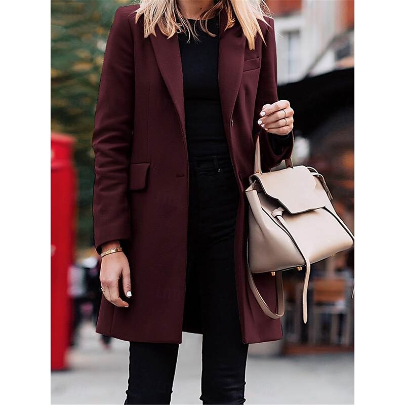 Highlights [Fabric] : Crafted from high-quality polyester, this women's coat is designed to provide thermal warmth and breathability, perfect for fall and winter seasons. The fabric offers a micro-elastic fit, ensuring both comfort and style. [Fit and Silhouette] : Featuring a regular fit, this long coat boasts a longline silhouette that enhances its stylish and casual appeal. The tailored cut flatters the figure while ensuring ease of movement. [Design Highlights] : The coat includes a classic turndown neckline and a single-breasted placket for a refined look. It is equipped with functional flap pockets, adding practicality to its chic design. Available in timeless colors like black, red, and coffee, the coat is a versatile choice for various outfits. [Occasions] : Suitable for daily wear, street style, outdoor activities, and office environments. This coat seamlessly transitions from professional settings to casual gatherings, making it an essential piece for any wardrobe. [Size Range] : Available in a comprehensive range of sizes from S to 2XL, accommodating diverse body types for an optimal fit in every style session.