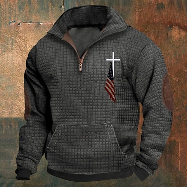 Highlights [Fabric and Material] : Crafted from a durable blend of polyester and waffle fabric, this men's sweatshirt offers a textured feel that combines comfort with style. The fabric choice ensures warmth while maintaining breathability, making it ideal for the transitional seasons of spring and fall. [Fit and Style] : Designed as a basic sweatshirt, this piece features a regular fit that provides a relaxed yet stylish silhouette. The micro-elasticity accommodates ease of movement without sacrificing shape. [Design Highlights] : The sweatshirt features a half-zip neckline, allowing for easy wear and customized ventilation. The striking cross print carries an American flag motif, lending a subtle yet eye-catching element of style. Elbow patches enhance durability, complementing the rugged look, while the ribbed cuffs and hem offer a snug fit for added warmth. The front kangaroo pocket not only adds practicality but also furthers the casual aesthetic. [Occasions] : Whether you're heading out for a day of outdoor activities, a casual daily outing, or any holiday event, this sweatshirt offers versatile styling options. It's perfect for streetwear looks or as sportswear, adding a touch of casual sophistication to your wardrobe. [Size Range] : Available in a range of sizes from S to 3XL, this sweatshirt caters to a variety of body types, ensuring everyone finds their perfect fit.