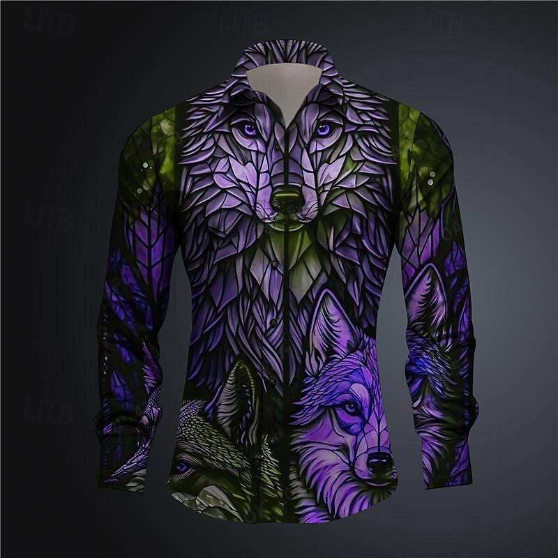 More information about Men's Color Block Wolf Colorful Button Up Shirt Printed Shirts Long Sleeve Subcultural Vacation Party Street Spring & Summer Turndown Print Button-Down Pink Blue Purple Green