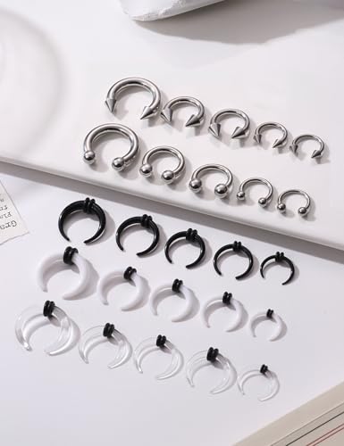 • Complete Septum Stretching Kit: Get a comprehensive set of 25 pieces septum pincher stretching kit, including 5 black acrylic septum pinchers, 5 white acrylic pincher septum, 5 clear acrylic pincher septum rings, 5 stainless steel horseshoe circular barbells stretching septum with ball ends, and 5 with spike ends. This variety of styles and sizes ensures plenty of options for wearing, whether you're looking for a bold or subtle look. Perfect for anyone starting or expanding their septum stretching journey with multiple choices in one kit