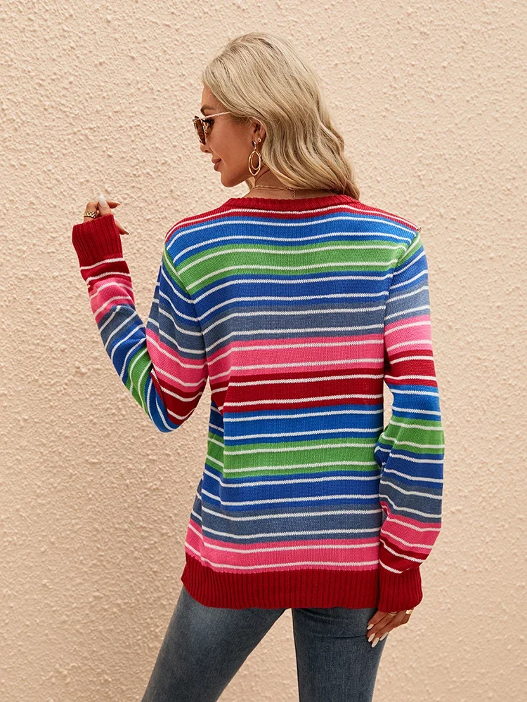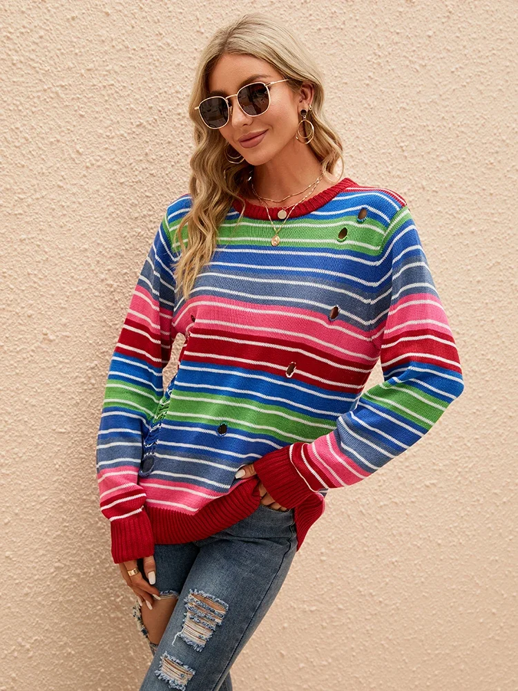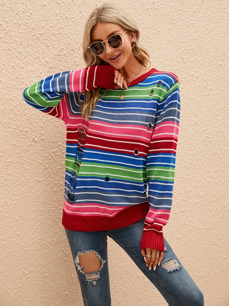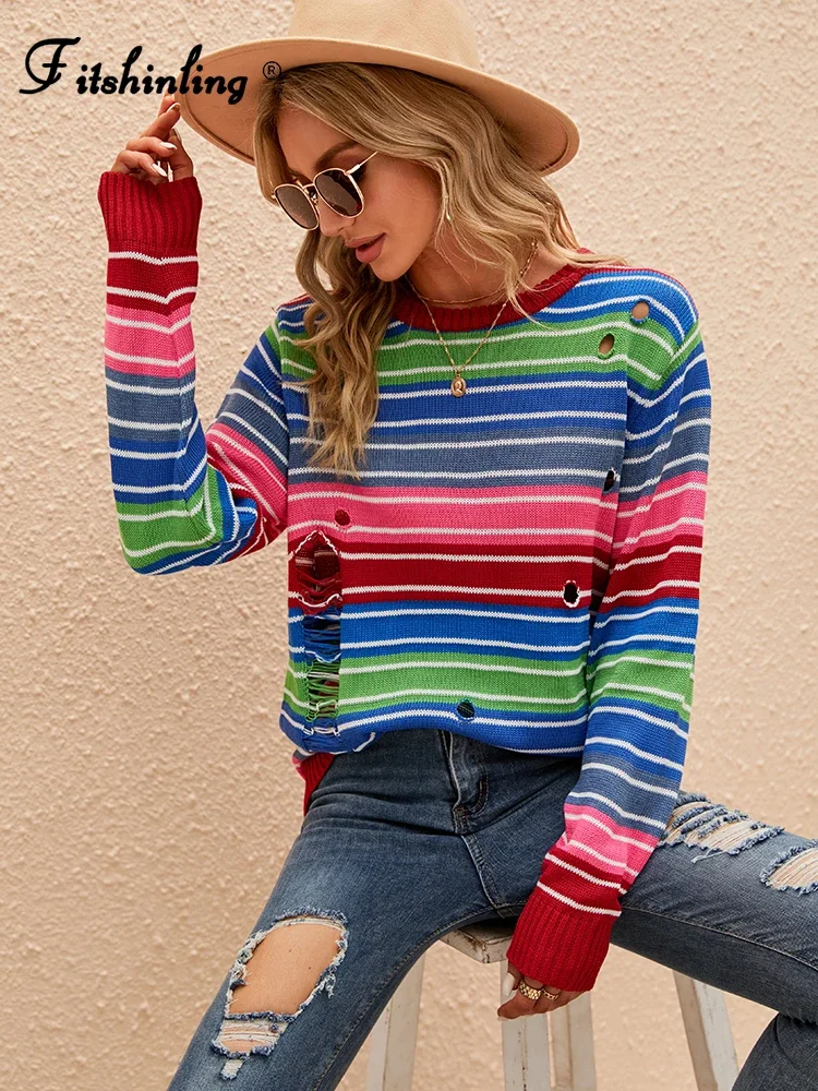 Fitshinling Vintage Sweater For Women Clothing Boho Multicolor Striped Slim Jumper Pullover Knit Long Sleeve Top Hole Jersey New