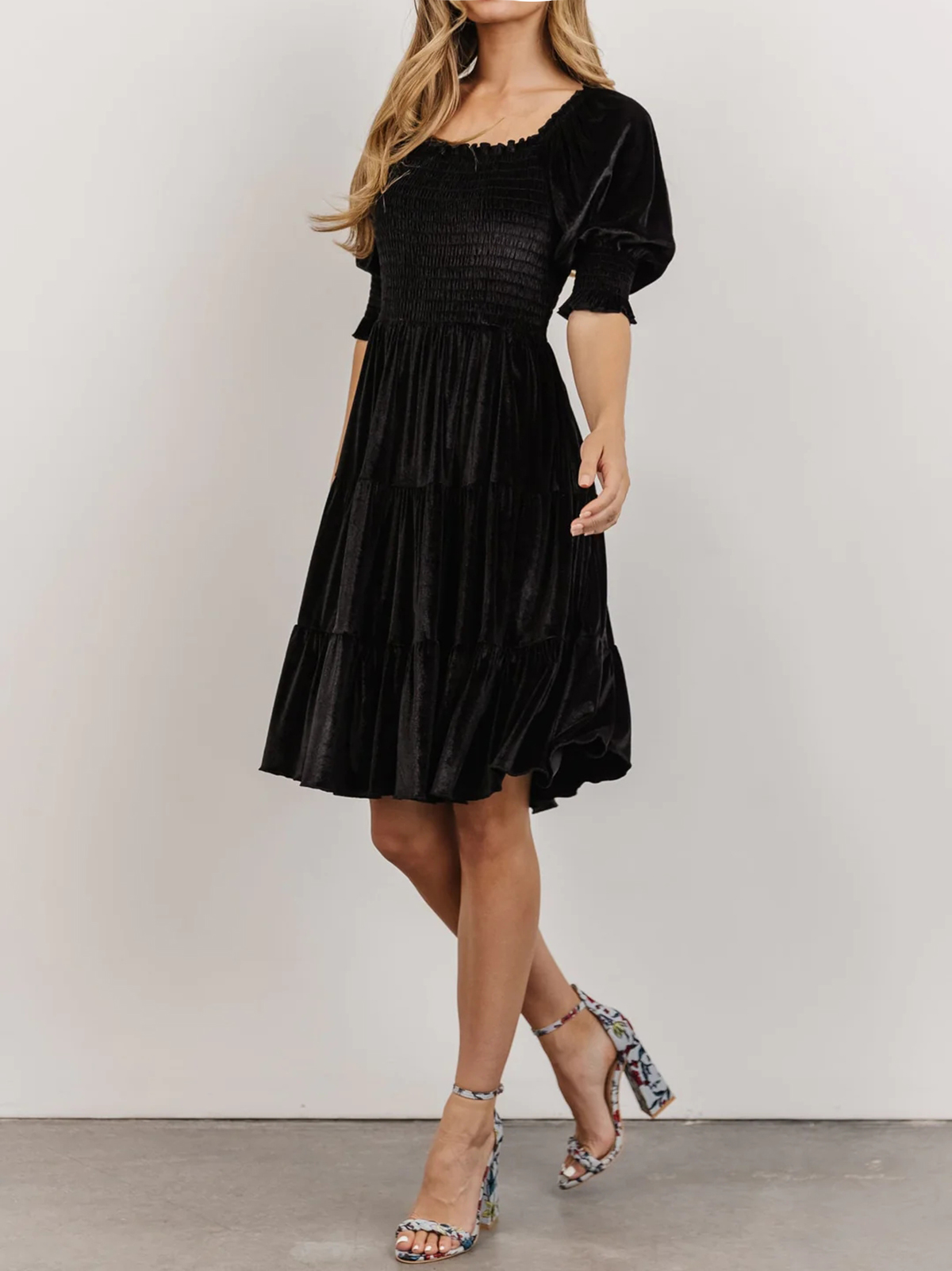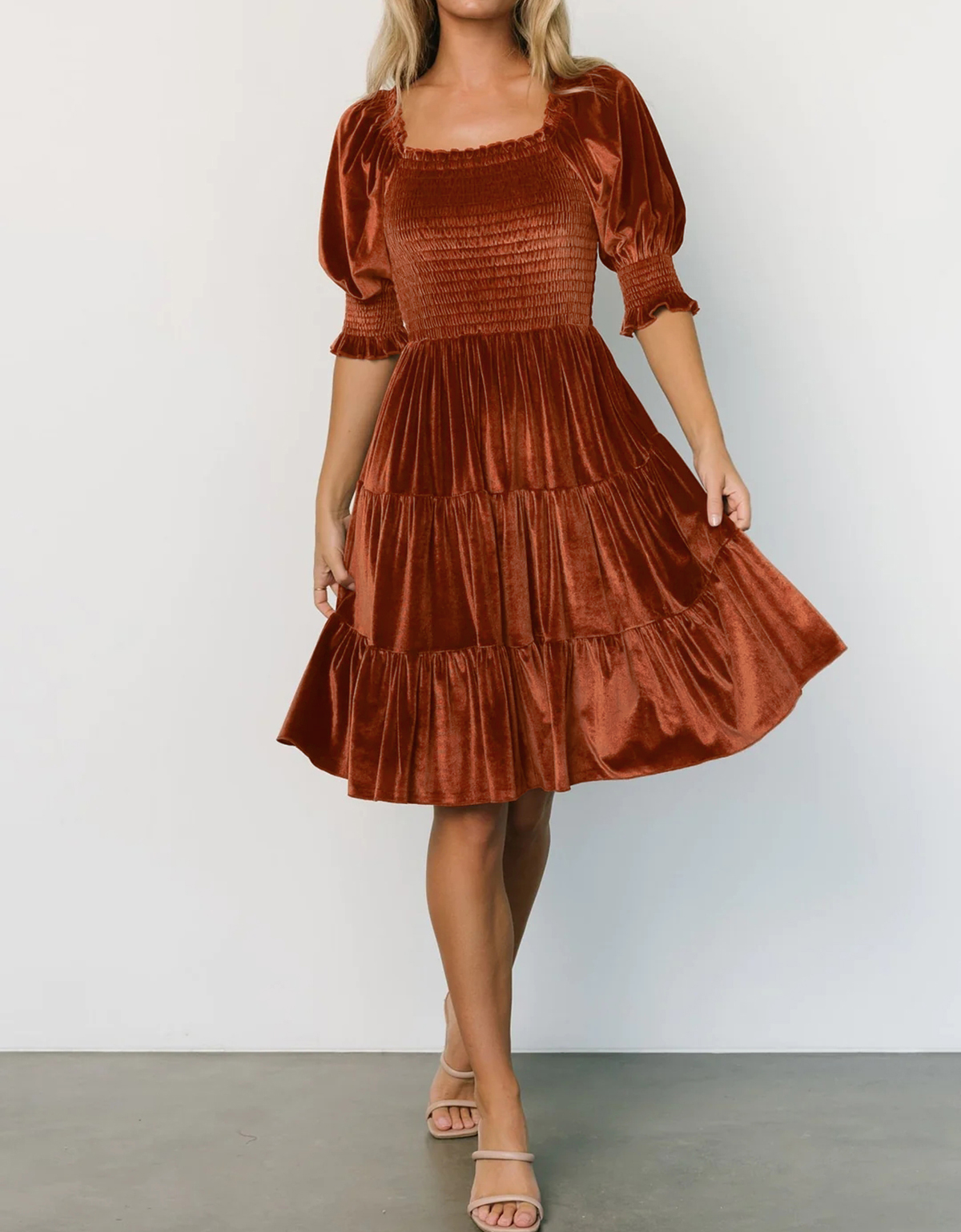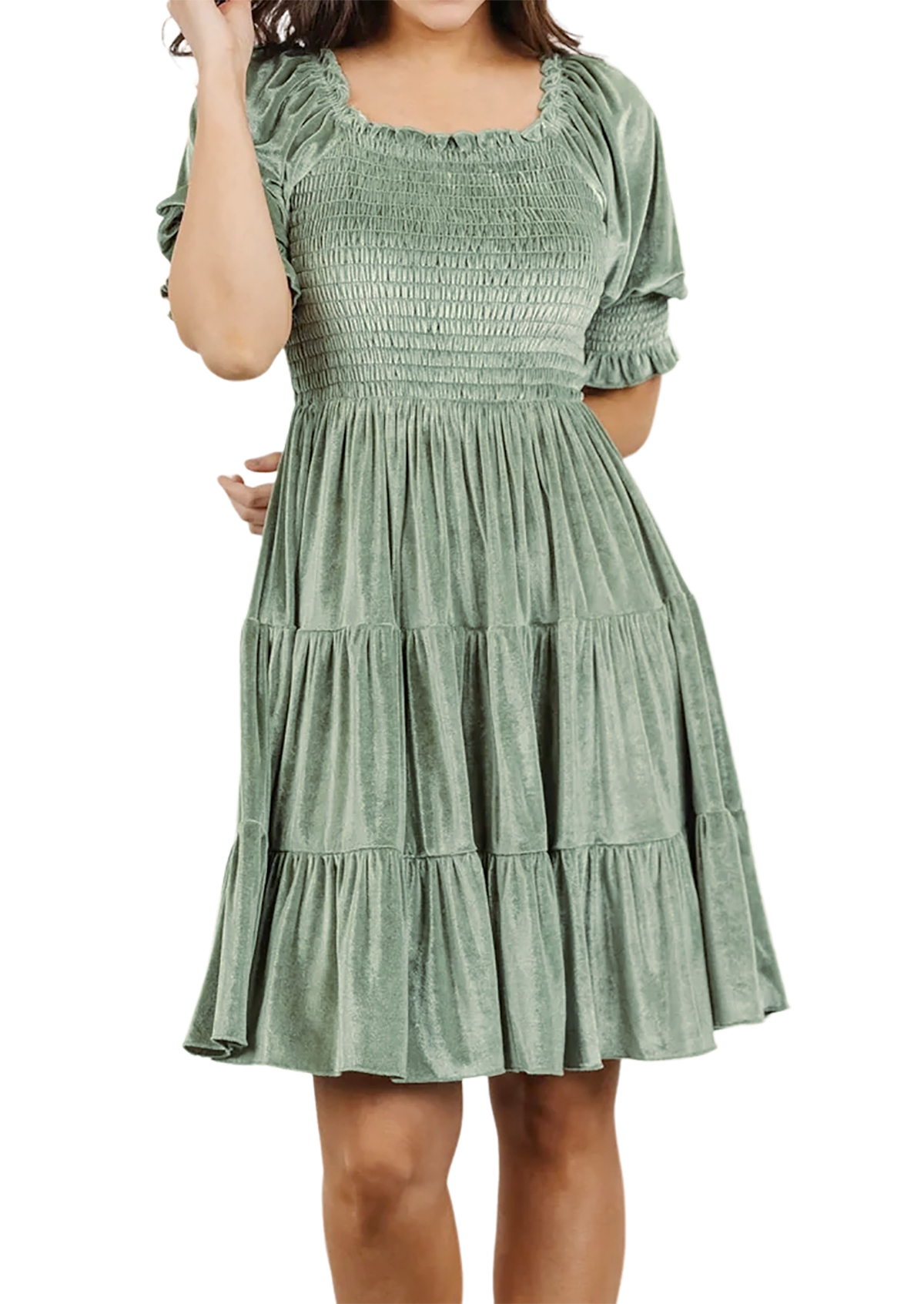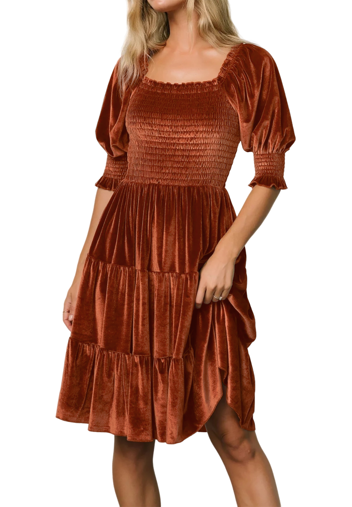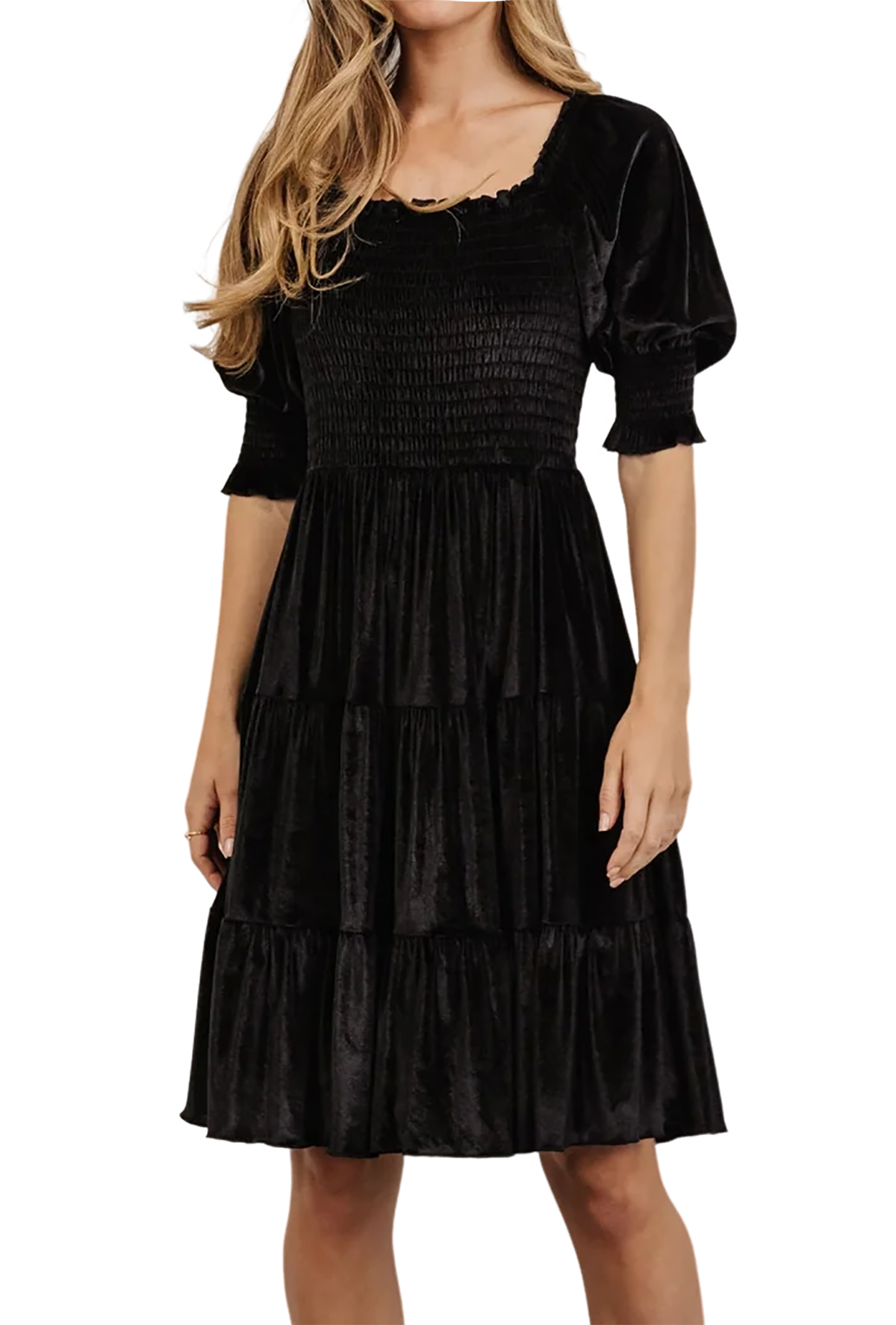 The velvet dress has a flowy and relaxed fit that is suitable for women of different body types. The smocked top not only adds style but also provides stretchy comfort while the tiered ruffle silhouette hem adds a chic and feminine touch, giving the dress a casual yet dressy flair!