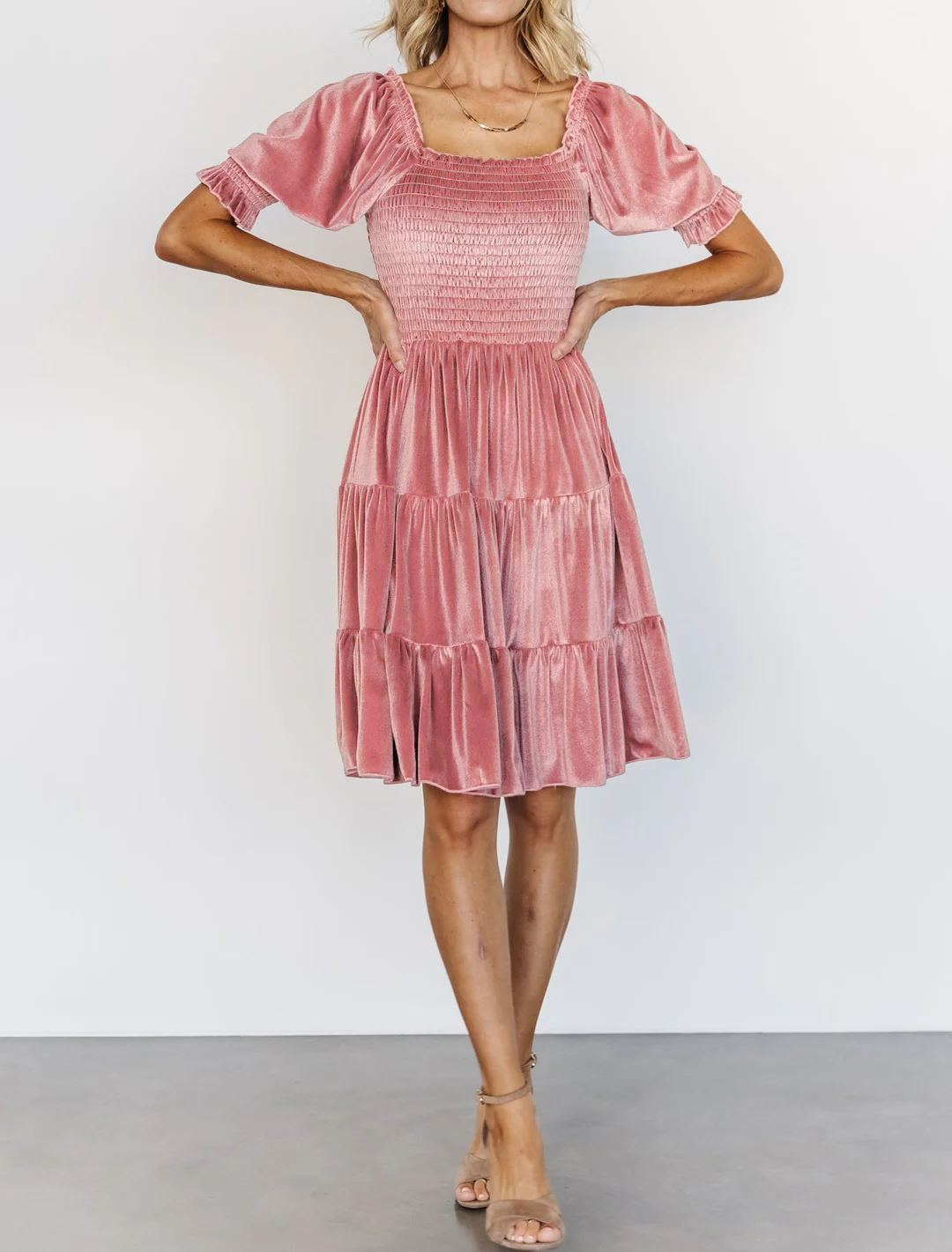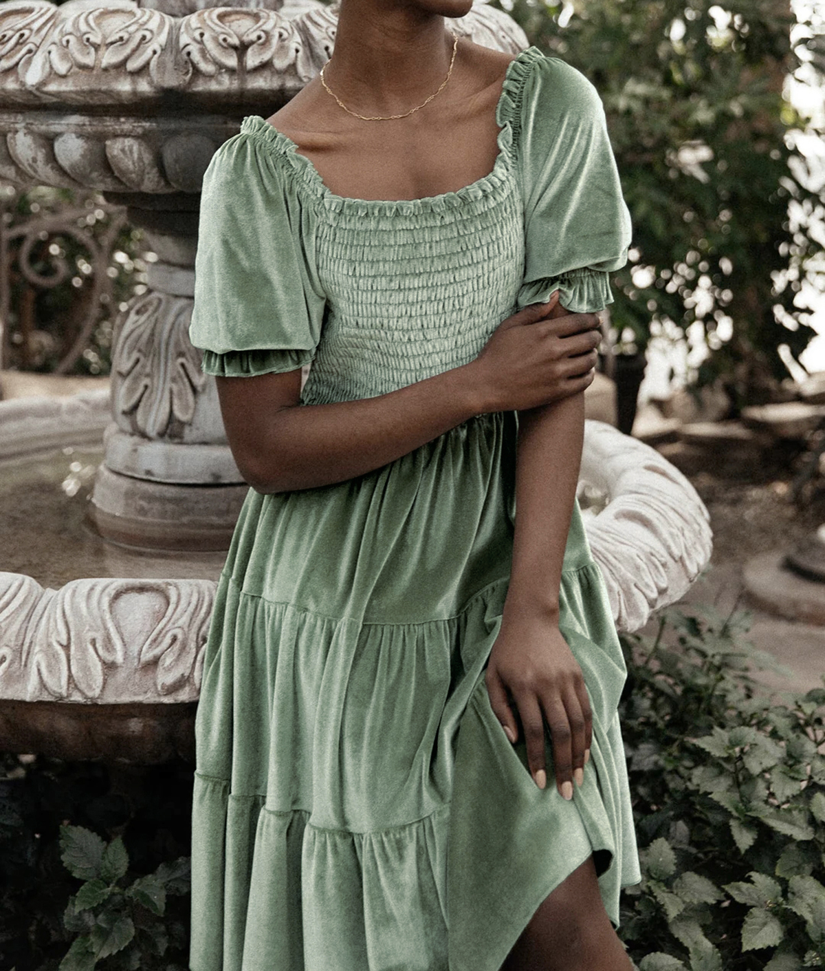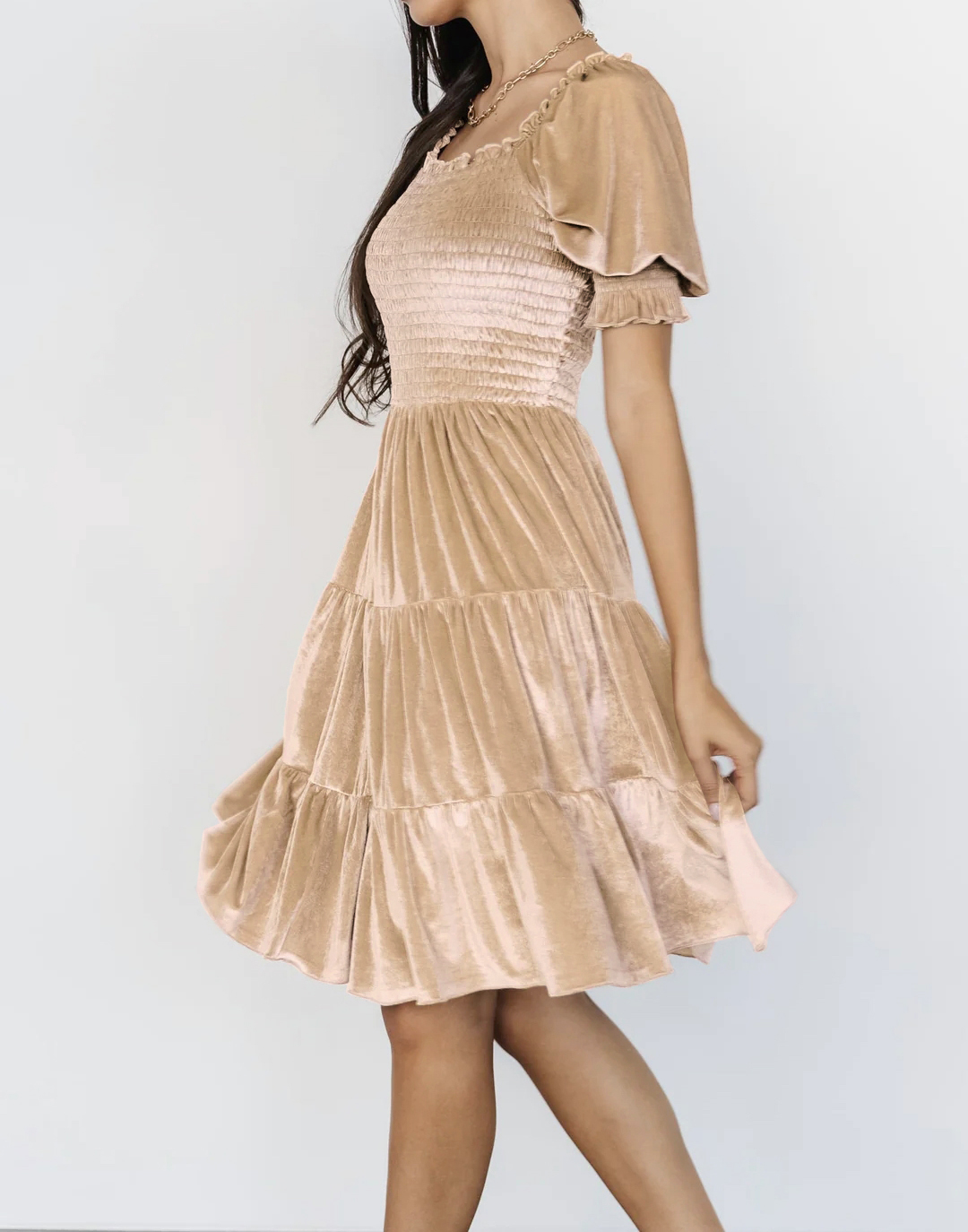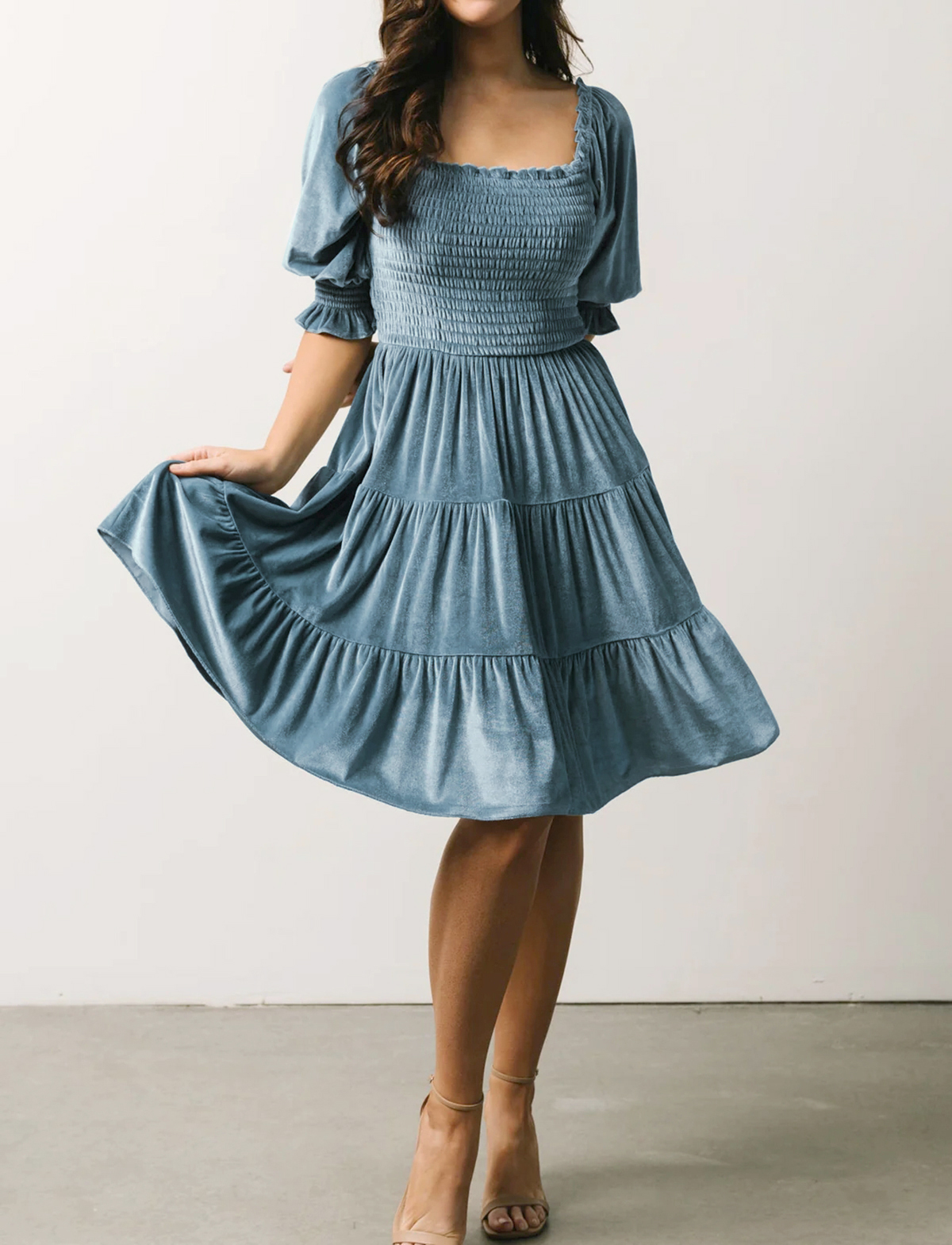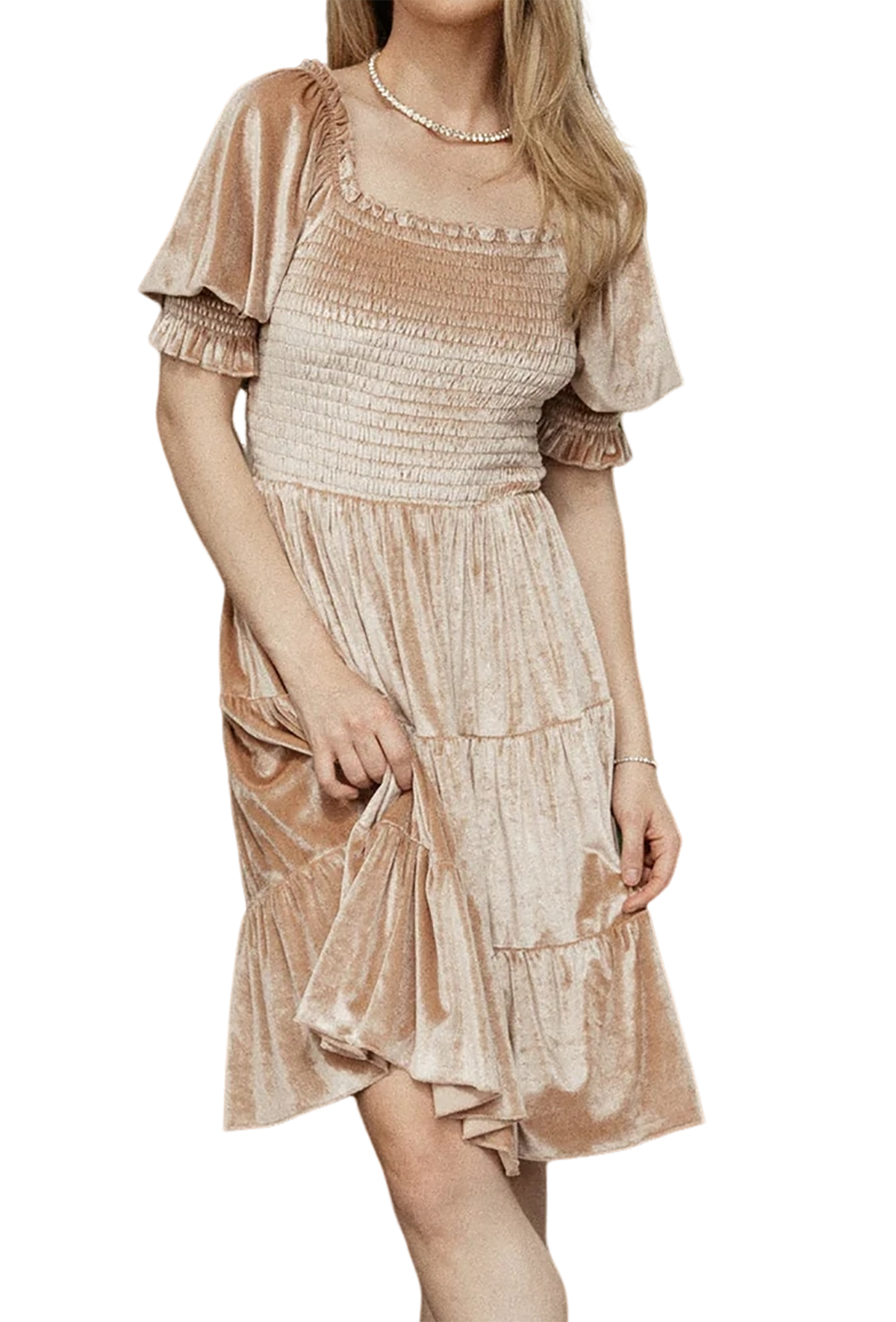 The velvet dress has a flowy and relaxed fit that is suitable for women of different body types. The smocked top not only adds style but also provides stretchy comfort while the tiered ruffle silhouette hem adds a chic and feminine touch, giving the dress a casual yet dressy flair!