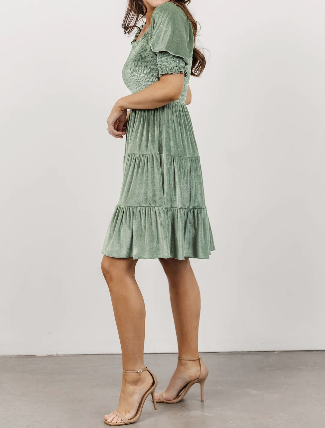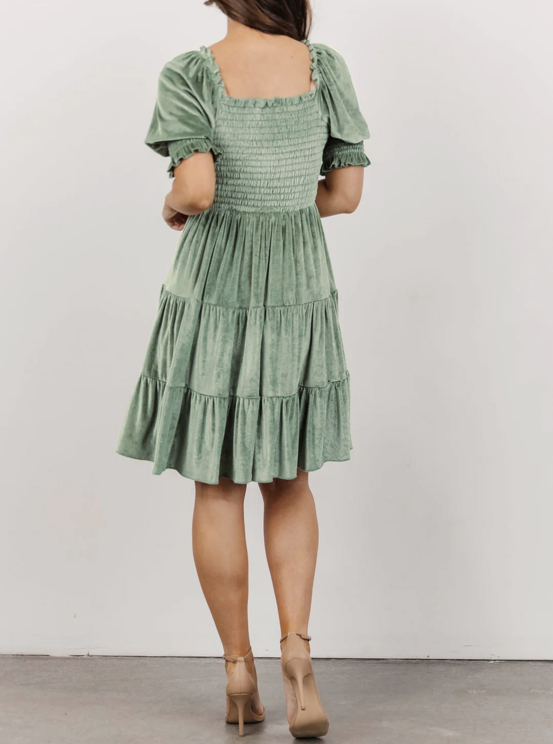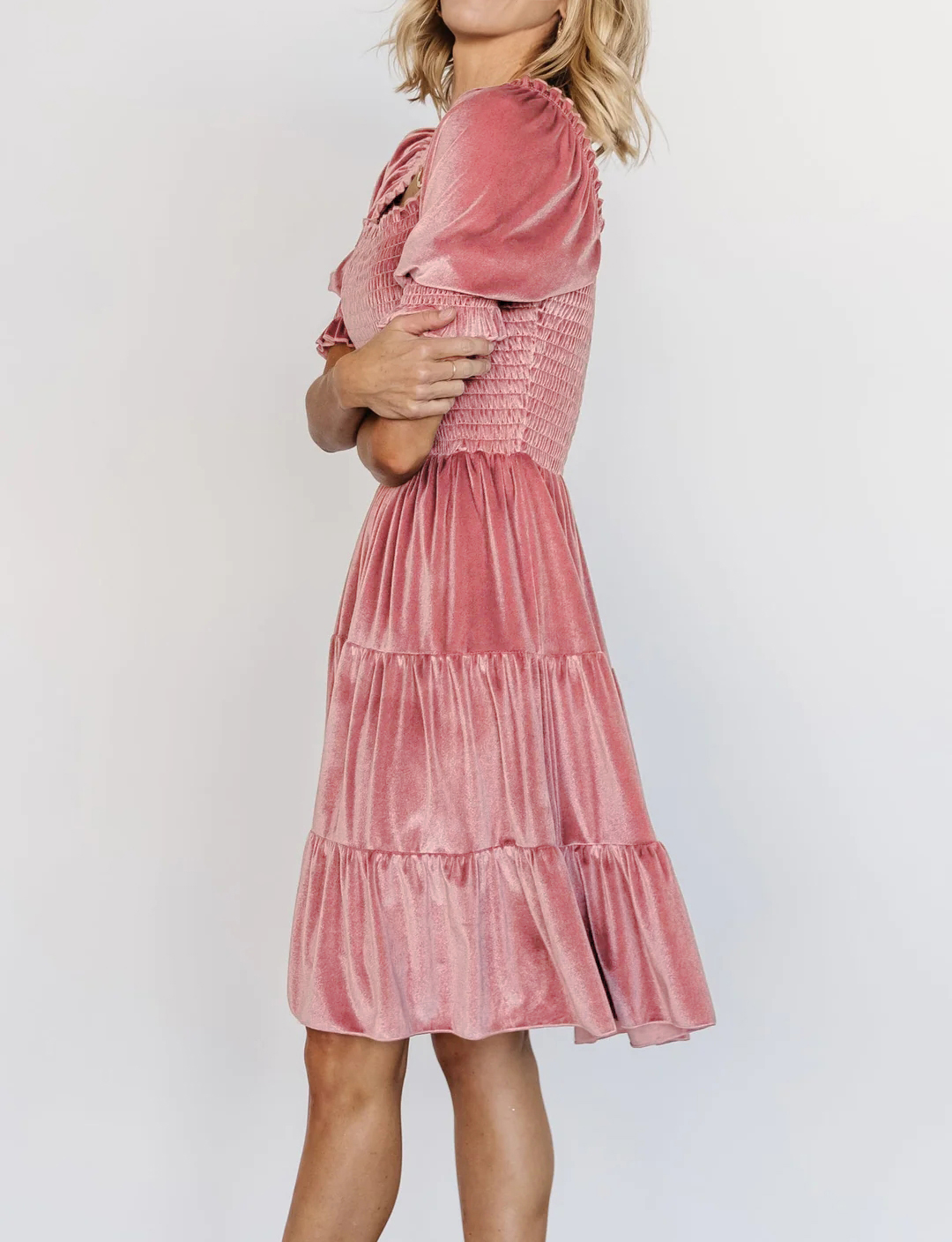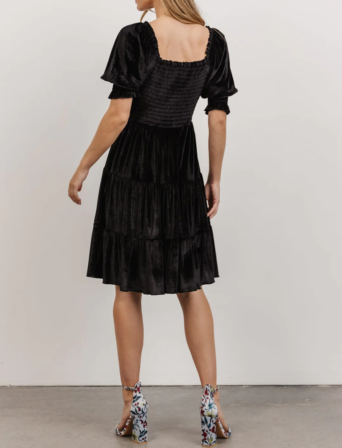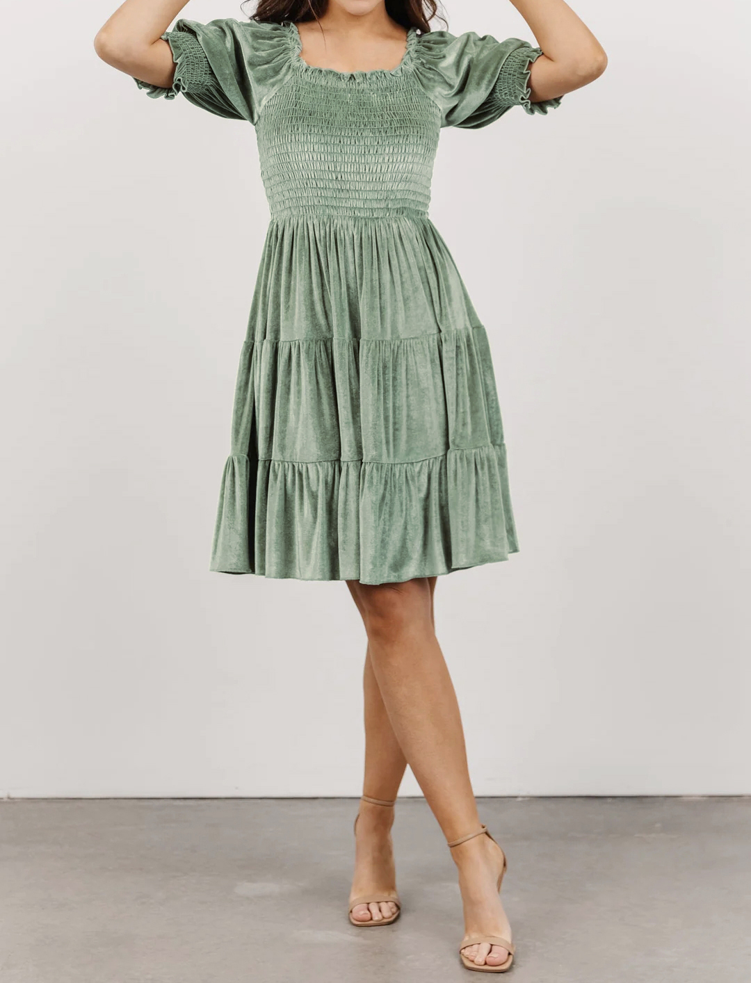 The velvet dress has a flowy and relaxed fit that is suitable for women of different body types. The smocked top not only adds style but also provides stretchy comfort while the tiered ruffle silhouette hem adds a chic and feminine touch, giving the dress a casual yet dressy flair!