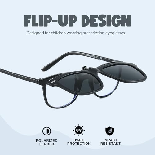 • 👓 Designed for Kids: This clip-on sunglasses can be easily flipped to fit your child's regular glasses, no need to buy extra special sunglasses, one pair of glasses to realize two functions, flexible and convenient for daily wear, to meet the eye needs of different scenarios.