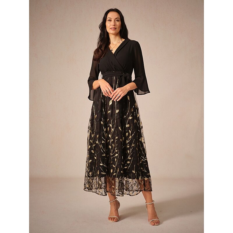 HOT ! Women's Midi Dress V-Neck Long Sleeve Sheer Gold Branch Pattern Belted Elegant Party Evening Black Gold Full Size