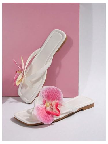 Women's 3D Floral Appliques Flip Flops Flat Sandals Flower Square Open Toe Thong Summer Beach Sandals 3
