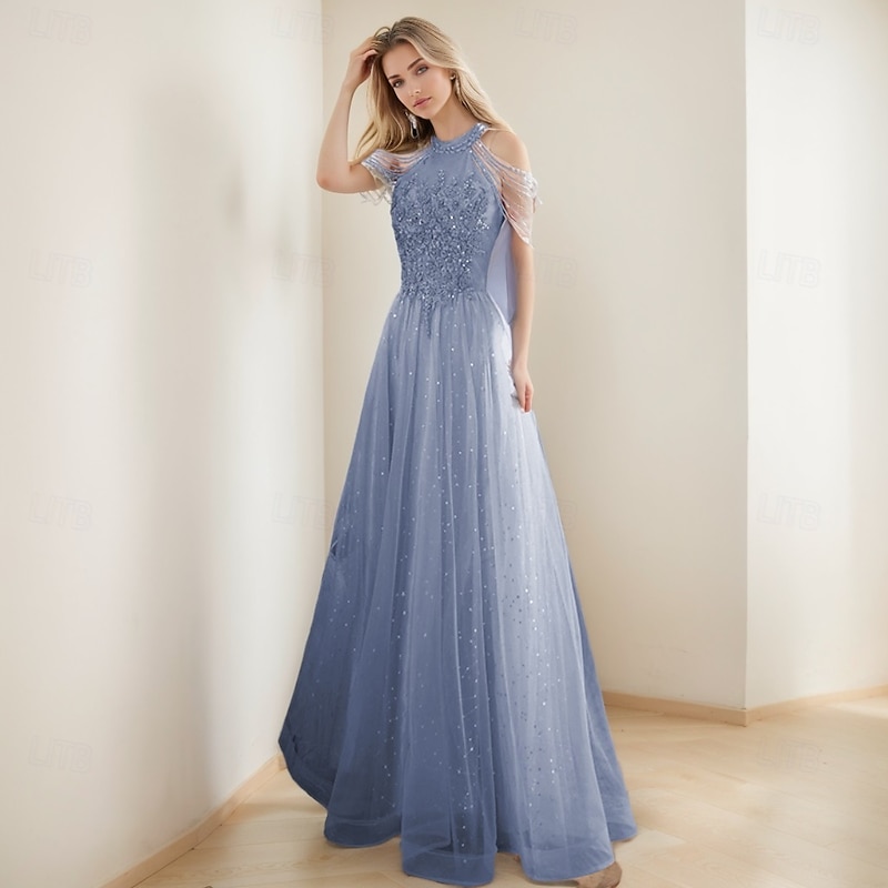 Highlights [Fabric] : Crafted from high-quality tulle, this A-Line evening gown is embellished with glitter tassels, offering a luxurious and eye-catching appearance. The delicate tulle fabric adds a touch of elegance to the overall design, ensuring both comfort and style. [Silhouette] : The dress features a classic A-Line silhouette that falls gracefully to the floor length. The design is tailored to flatter various body types, making it a versatile choice for different figures. [Design Highlights] : Showcasing a sophisticated high neck and sleeveless cut, the gown incorporates intricate embroidery and sheer, embellished cap sleeves that enhance its elegance. Sparkling accents throughout the fabric catch the light beautifully, adding a glamorous touch to any special occasion. [Occasions] : Perfect for proms, formal events, and other special gatherings, this vintage-inspired dress exudes timeless grace and sophistication. Whether attending a prom or a formal dinner, it ensures the wearer stands out with style. [Size Range] : Available in a range of sizes from S to XXL, this dress caters to a variety of body shapes. Please note that colors may vary slightly due to different monitor settings, and it is recommended to have the dress professionally dry cleaned. Perfect for everyday use. premium materials and excellent craftsmanship ensure long-lasting durability.